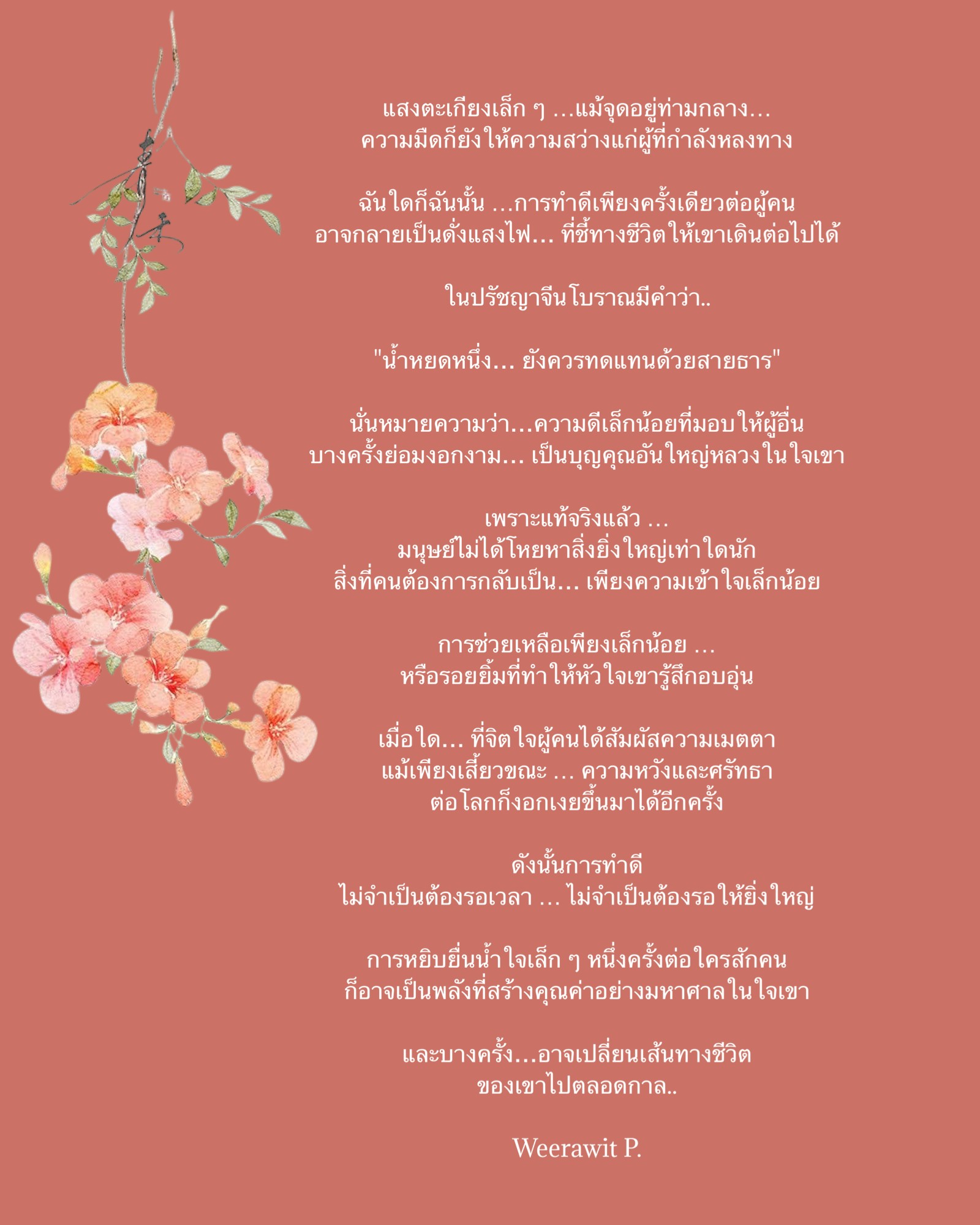 จงเป็นเหตุผลที่ทำให้ใครสักตน...ยังเชื่อว่าความดีงามมีอยู่จริงในโลกนี้ Cr.Wiwan Boonya