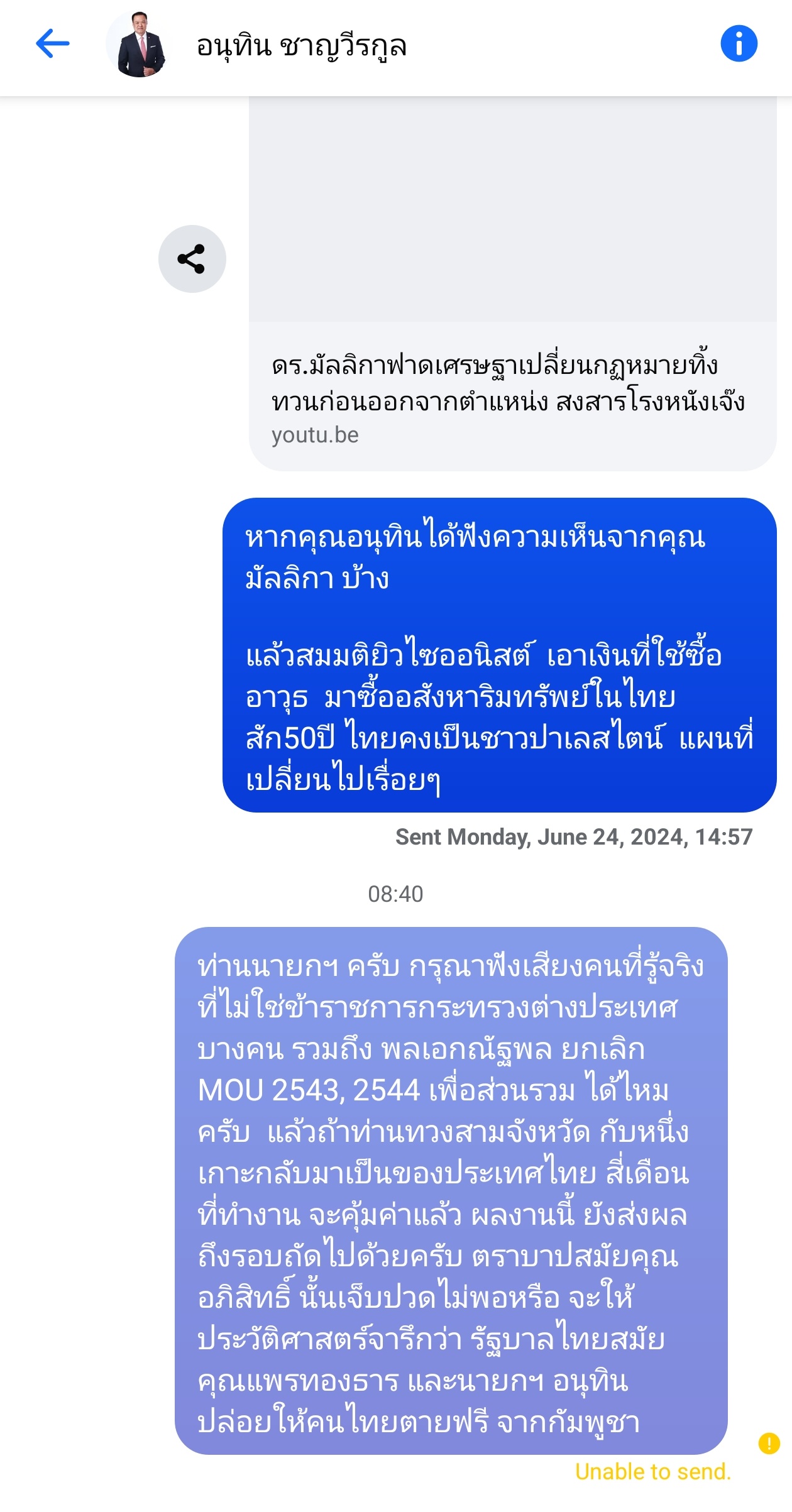 • ท่านนายกฯ ท่านรองนายกฝ่ายกฎหมายครับ ผมใช้ตำแหน่ง เพื่อเตือนใจท่านว่านี้คืออำนาจ ที่ต้องตัดสินใจ MOU มันไม่ใช่สนธิสัญญา และถึงแม้มันเป็นอะไรก็แล้วแต่ กัมพูชา ได้ฆ่าผู้บริสุทธิ์ ยั่วยุ ไม่สิ้นสภาพความเป็นภัย พวกคุณจะรออะไร โอกาสมาแล้วตั้งหลายเดือน ประชาชนได้แสดงออก บริจาคเงินซื้อโดรน ทำถนน ทำรั้ว เชื้อพระวงศ์ ก็ร่วมสร้างความปลอดภัยให้ประชาชนชายแดน แล้วพวกคุณยังโบ้ยไปลงประชามติ ใจพวกคุณ มีสีแดงของธงชาติไทย บ้างไหมครับ หรือเลือดสีแดงพวกคุณ มันคือแดง-น้ำเงิน มีหินปูน ของธงชาติกัมพูชา ครับ