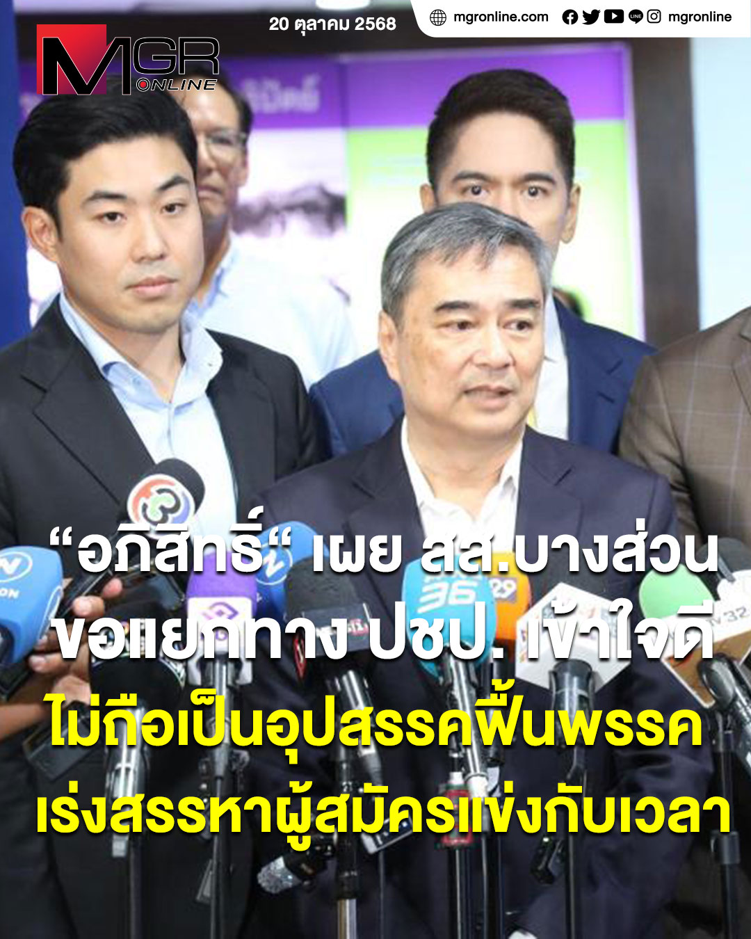 เมื่อวันที่ 20 ต.ค. เวลา 10.40 น. ที่พรรคประชาธิปัตย์ นายอภิสิทธิ์ เวชชาชีวะ หัวหน้าพรรคประชาธิปัตย์ ให้สัมภาษณ ภายหลังการประชุมคณะกรรมการบริหารพรรคประชาธิปัตย์ชุดใหม่ ว่า วันนี้เป็นการประชุมครั้งแรกของคณะกรรมการบริหารพรรคฯ ที่ได้รับเลือกเมื่อวันที่ 18 ต.ค.ที่ผ่านมา ทั้งนี้เราต้องรอการรับรองของคณะกรรมการการเลือกตั้ง (กกต.) ก่อนทํางานอย่างเป็นทางการ แต่ได้มีการปรึกษาหารือกันแล้ว ว่าเรามีเวลามันน้อยมาก สําหรับเรื่องหลักที่ได้พูดคุยกันในวันนี้ คือ 1.นโยบาย เพราะสิ่งสําคัญที่สุดในการทํางานของคณะกรรมการบริหารพรรคชุดนี้ คือ 1.ต้องสร้างความหวังให้ประชาชนให้ได้ หัวใจหลักของนโยบายของพรรคนั้น เรายืนยันว่ามีสิ่งดีๆ และความคิดดีๆ มากมาย แต่วันนี้ประเทศไทยจะยังทําไม่ได้ ถ้าเศรษฐกิจไม่โต เพราะเศรษฐกิจไทยติดหล่มมานานแล้ว เพราะฉะนั้น แนวคิดที่เราจะผลักดันให้เศรษฐกิจเติบโตซึ่งจะเกี่ยวพันไปถึงการยกเครื่องภาคการเกษตร การทําให้เศรษฐกิจไทยไปสู่เศรษฐกิจสีเขียว และเศรษฐกิจดิจิทัล รวมถึงลดความเหลื่อมล้ํา ลดการผูกขาด จะเป็นเรื่องที่เราต้องเร่งผลักดัน โดยได้มีการเชิญผู้ทรงคุณวุฒิที่จะมาให้ความคิดเห็นกับเรา ในวันที่ 28 ต.ค.นี้ ซึ่งเรามีการตั้งโจทย์ให้กับผู้ทรงคุณวุฒิเหล่านี้ว่าประเทศไทยต้องการอะไรจากการเมือง ซึ่งกระบวนการดังกล่าว นายกรณ์ จาติกวณิช รองหัวหน้าพรรค นี้จะเป็นผู้รับผิดชอบเรื่องนโยบายของพรรค