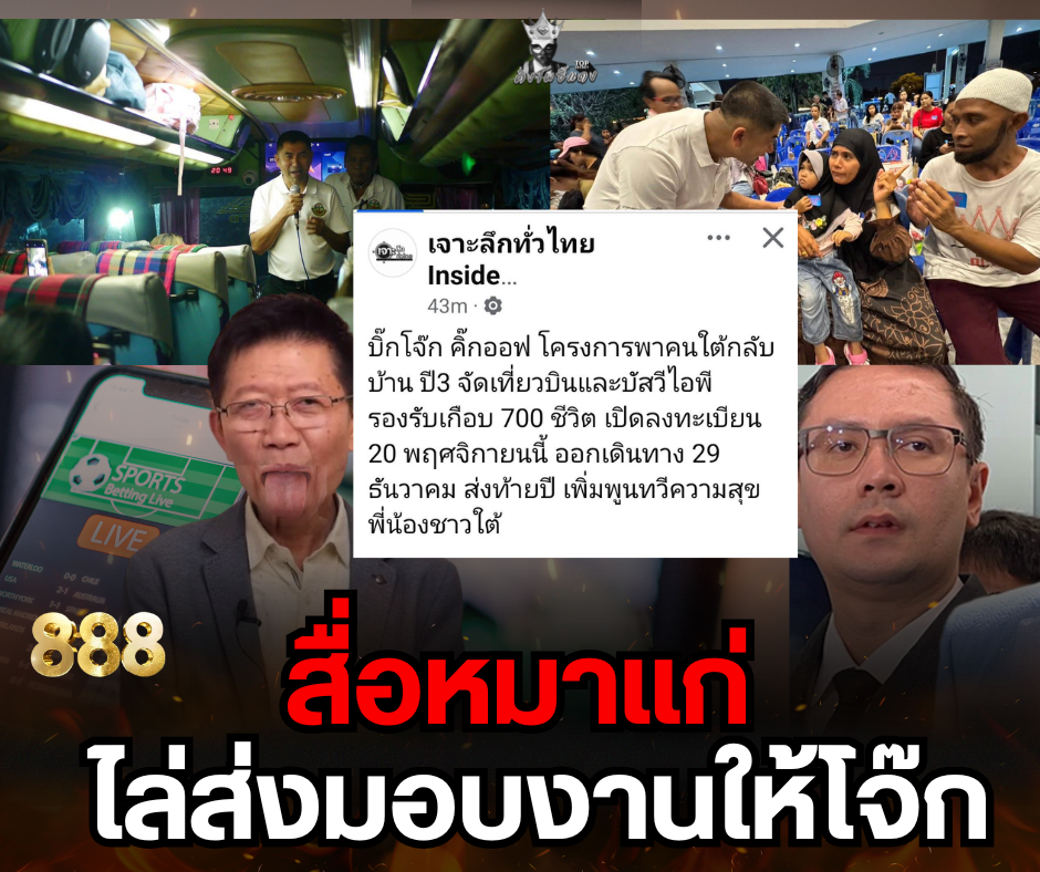 • ดนัย สื่อหมาแก่ ยังติดค้างงานรับใช้โจ๊กอยู่หลายชิ้น เพราะก่อนหน้านี้โจ๊กสิ้นอำนาจไปไม่ทันบอกลา มาวันนี้จึงต้องกลับมารับใช้อีกครั้ง อวยยศโครงการพาคนใต้กลับบ้าน ด้วยเงินเทาเว็บพนัน888 ตำรวจเชี้ยไรมีเงินมาเหมารถบัส เครื่องบินให้คนขึ้นฟรี ไอ้โรม นังไอซ์ ตรวจสอบเงินบริจาคสมาคมฯมันหน่อยสิว่ะ