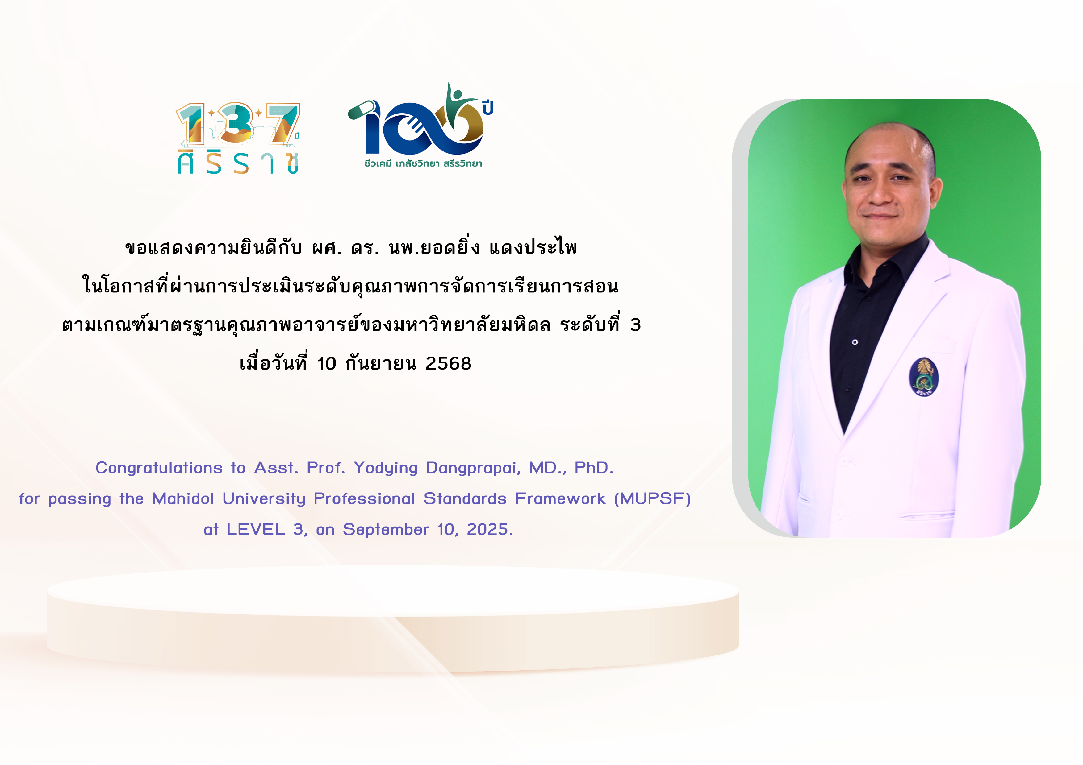 ขอแสดงความยินดีกับ ผศ. ดร. นพ.ยอดยิ่ง แดงประไพ ในโอกาสที่ผ่านการประเมินระดับคุณภาพการจัดการเรียนการสอน ตามเกณฑ์มาตรฐานคุณภาพอาจารย์ของมหาวิทยาลัยมหิดล ระดับที่ 3 เมื่อวันที่ 10 กันยายน 2568