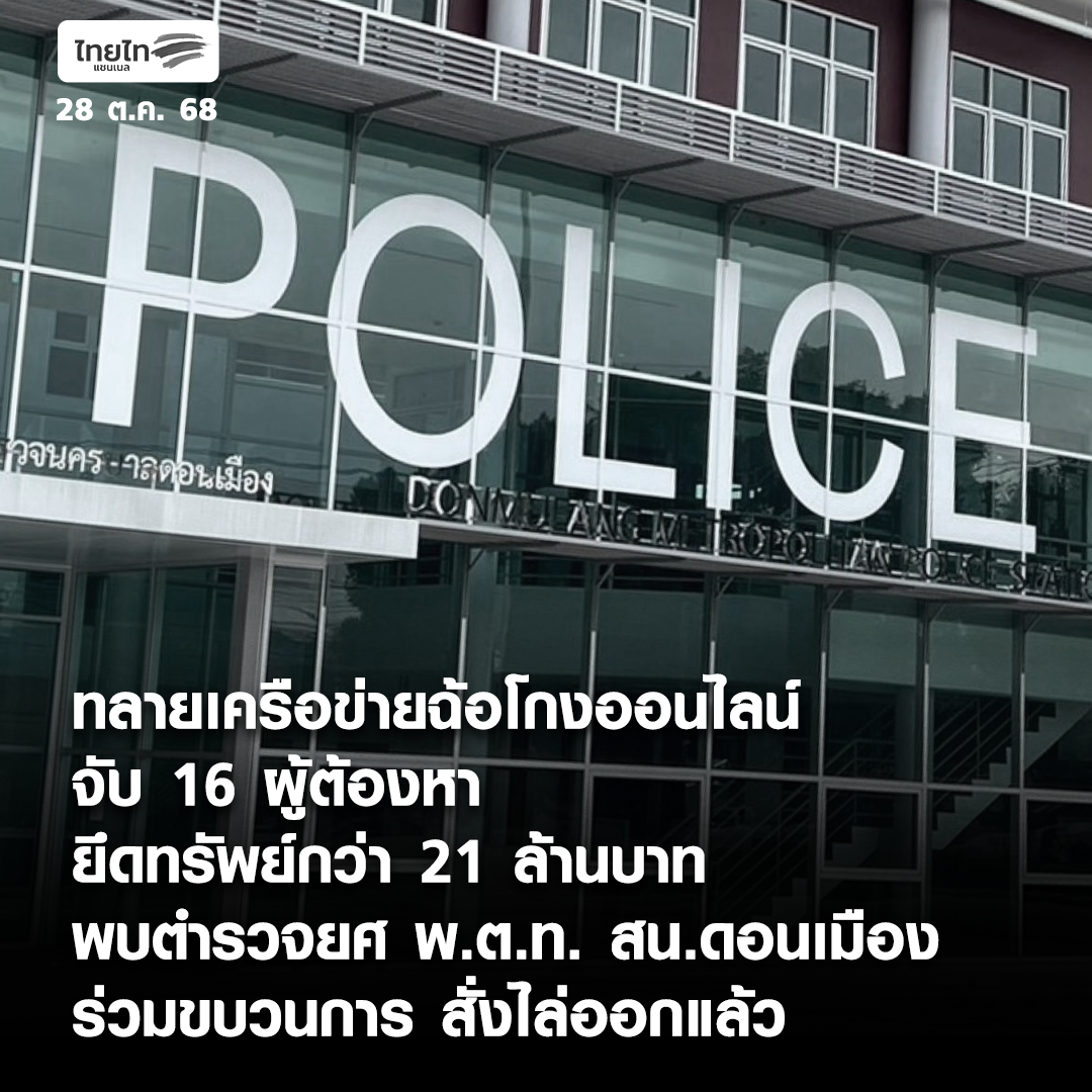 • ทลายเครือข่ายฉ้อโกงออนไลน์ จับ 16 ผู้ต้องหา ยึดทรัพย์กว่า 21 ล้านบาท พบตำรวจยศ พ.ต.ท. สน.ดอนเมือง ร่วมขบวนการ สั่งไล่ออกแล้ว