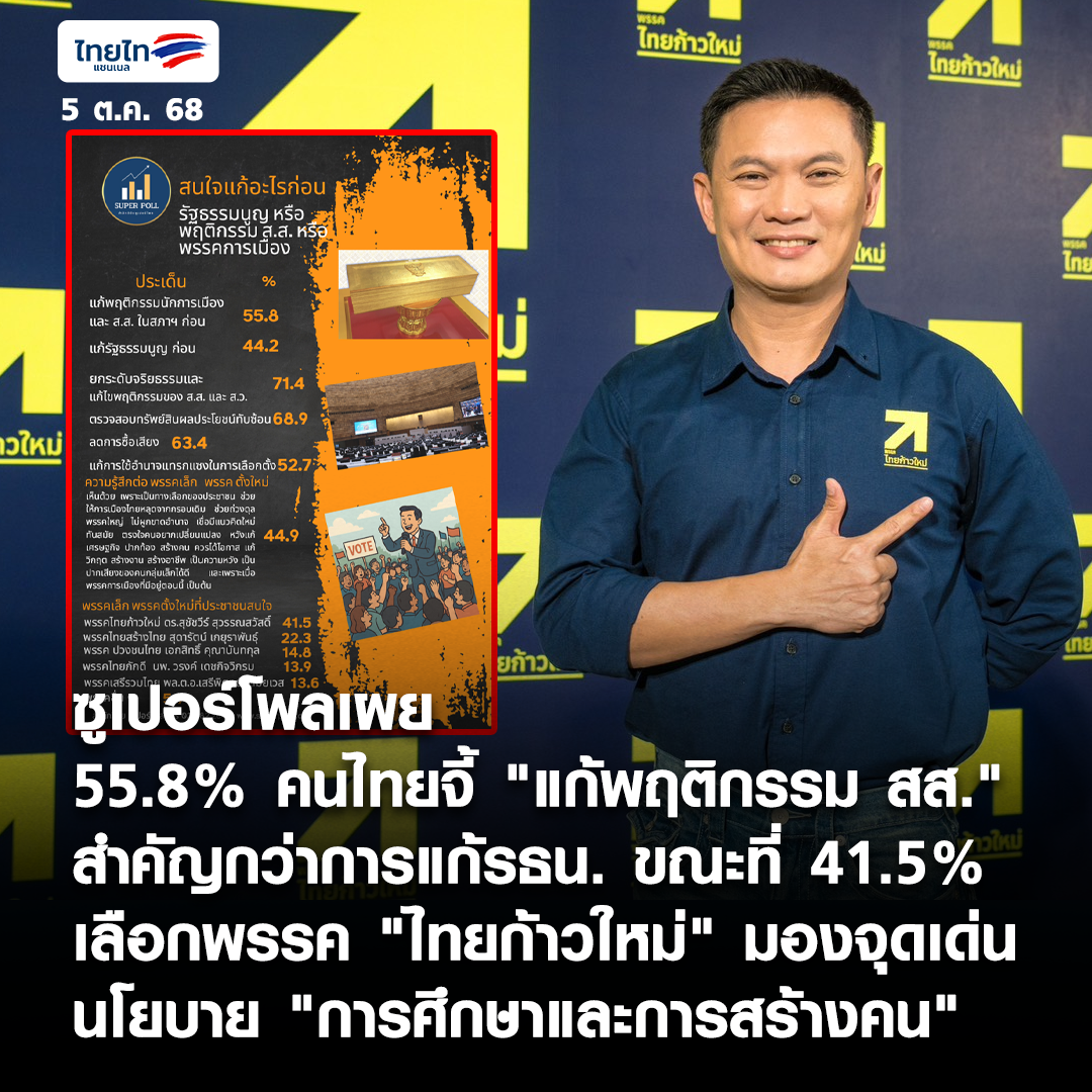 • ซูเปอร์โพลเผย 55.8% คนไทยจี้ "แก้พฤติกรรม สส." สำคัญกว่าการแก้รธน. ขณะที่ 41.5% เลือกพรรค "ไทยก้าวใหม่" มองจุดเด่น นโยบาย "การศึกษาและการสร้างคน"
