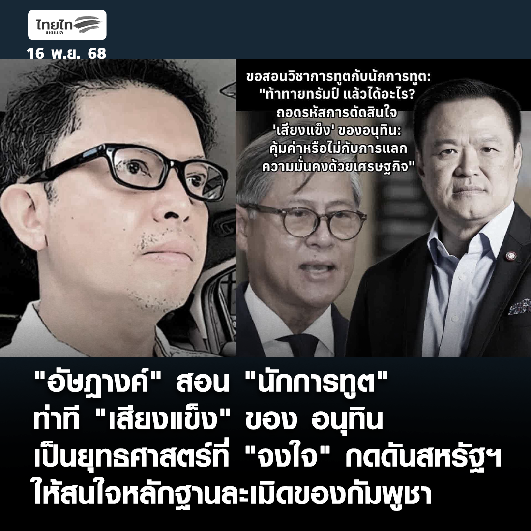"อัษฎางค์" สอน "นักการทูต" ท่าที "เสียงแข็ง" ของ อนุทิน เป็นยุทธศาสตร์ที่ "จงใจ" กดดันสหรัฐฯ ให้สนใจหลักฐานละเมิดของกัมพูชา https://www.thai-tai.tv/news/22406/ . #ไทยไท #อนุทิน #การทูตเสียงแข็ง #ภูมิรัฐศาสตร์ #อำนาจต่อรอง #กำแพงภาษี