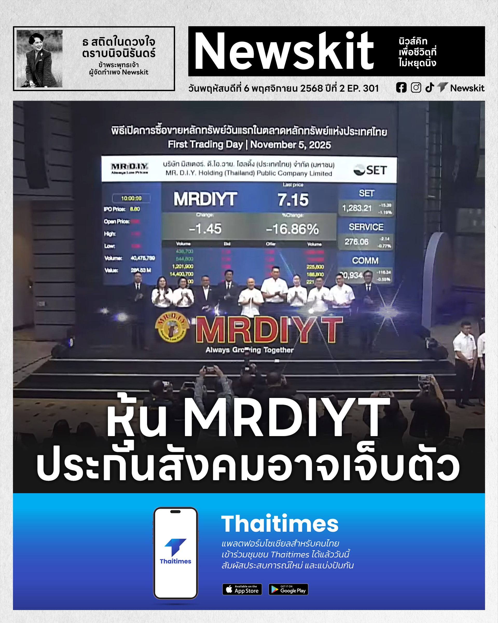 หุ้น MRDIYT ประกันสังคมอาจเจ็บตัว ทำเอานักลงทุนใจหายใจคว่ำ เมื่อหุ้น MRDIYT ของบริษัท มิสเตอร์. ดี.ไอ.วาย. โฮลดิ้ง (ประเทศไทย) จำกัด (มหาชน) ร้านค้าปลีกอุปกรณ์ตกแต่งบ้าน และสินค้าไลฟ์สไตล์ สัญชาติมาเลเซีย เข้าซื้อขายในตลาดหลักทรัพย์แห่งประเทศไทย เมื่อวันที่ 5 พ.ย. เป็นวันแรก ปรากฎว่าเปิดการซื้อขายที่ 7.05 บาท ต่ำกว่าราคาจองซื้อแบบ IPO ซึ่งกำหนดไว้ที่ 8.60 บาท หรือประมาณ 18% ก่อนที่ราคาจะขยับในระดับ 8 บาท สูงที่สุด 8.70 บาท ก่อนปิดการซื้อขายที่ราคา 8.60 บาท เท่ากับราคาจองซื้อ มูลค่าการซื้อขาย 4,698.30 ล้านบาท MRDIYT ประกอบธุรกิจร้านมิสเตอร์. ดี.ไอ.วาย. ในไทย ก่อตั้งเมื่อปี 2559 ปัจจุบันมีสาขา 1,027 แห่ง ใน 77 จังหวัด ระดมทุนจากการเสนอขายหุ้นครั้งแรก 5,600 ล้านบาท เพื่อนำไปชำระหนี้สินและเงินกู้ยืมที่มีอยู่ของบริษัทฯ รวมถึงเงินกู้ยืมจากธนาคารซีไอเอ็มบีไทย 2,058.40 ล้านบาท ใช้ในการขยายสาขา ลงทุนบริษัทย่อย ซื้อที่ดินสำหรับคลังสินค้าเพิ่มเติม 500 ล้านบาท และใช้เป็นแหล่งเงินทุนหมุนเวียน 721.30 ถึง 845.40 ล้านบาท ถือเป็นบริษัทจดทะเบียนใหม่ที่ระดมทุนสูงที่สุดในรอบ 3 ปี บทความของ สุนันท์ ศรีจันทรา ในหนังสือพิมพ์ผู้จัดการรายวัน 360 ตั้งข้อสังเกตว่า หุ้น MRDIYT ได้รับความสนใจสูง เพราะเป็นบริษัทจดทะเบียนใหม่ขนาดใหญ่ มูลค่าหลักทรัพย์ตามราคาตลาด (Market Cap.) ประมาณ 5 หมื่นล้านบาท แต่การนำหุ้นจำนวน 655 ล้านหุ้น เสนอขายในราคา 8.60 บาท โดยมีอัตราส่วนราคาต่อกำไร (P/E Ratio) ประมาณ 23 เท่า "ถือว่าเป็นราคาขายที่ไม่ถูกนัก" อีกด้านหนึ่ง ยังมีประเด็นที่ผู้ถือหุ้นใหญ่บางรายนำหุ้น 553 ล้านหุ้น จาก 1,230 ล้านหุ้น หรือสัดส่วน 21% ของทุนจดทะเบียน ไปเป็นหลักทรัพย์ค้ำประกัน สำหรับข้อตกลงทางการเงินส่วนบุคคล หรือ "นำหุ้นไปจำนำ" และเตรียมขายหุ้นในวันแรกที่หุ้นเข้าซื้อขายอีก 4.07% ในราคาเดียวกับราคาที่เสนอขายนักลงทุน นอกจากนั้น ผู้ถือหุ้นใหญ่ยังเป็นต่างชาติ ซึ่งนักลงทุนหุ้นมูลค่าเพิ่มรายใหญ่บางคนจะหลีกเลี่ยง เพราะกลัวความเสี่ยงจากต่างชาติขายหุ้นทิ้ง หรือถ่ายเทเงินกลับบ้าน ซึ่งเคยเกิดขึ้นแล้วในหุ้นหลายตัว สิ่งที่น่าเป็นห่วงนอกเหนือจากหุ้น MRDIYT ต่ำกว่าราคาจองแล้ว พบว่าหนึ่งในผู้ถิอหุ้น คือ สำนักงานประกันสังคม จองซื้อผ่านทาง บลจ.ทาลิส 8,678,100 หุ้น และ บลจ.เอ็มเอฟซี จำกัด (มหาชน) อีก 1,225,400 หุ้น รวมแล้ว 9,903,500 หุ้น คิดเป็นมูลค่า 85,170,100 บาท คนที่เจ็บตัวมากที่สุดคือผู้ประกันตนกว่า 24.8 ล้านราย เพราะกลายเป็นการนำเงินของผู้ประกันตนไปซื้อหุ้นที่ไม่รู้อนาคตว่าจะรุ่งหรือร่วง #Newskit
