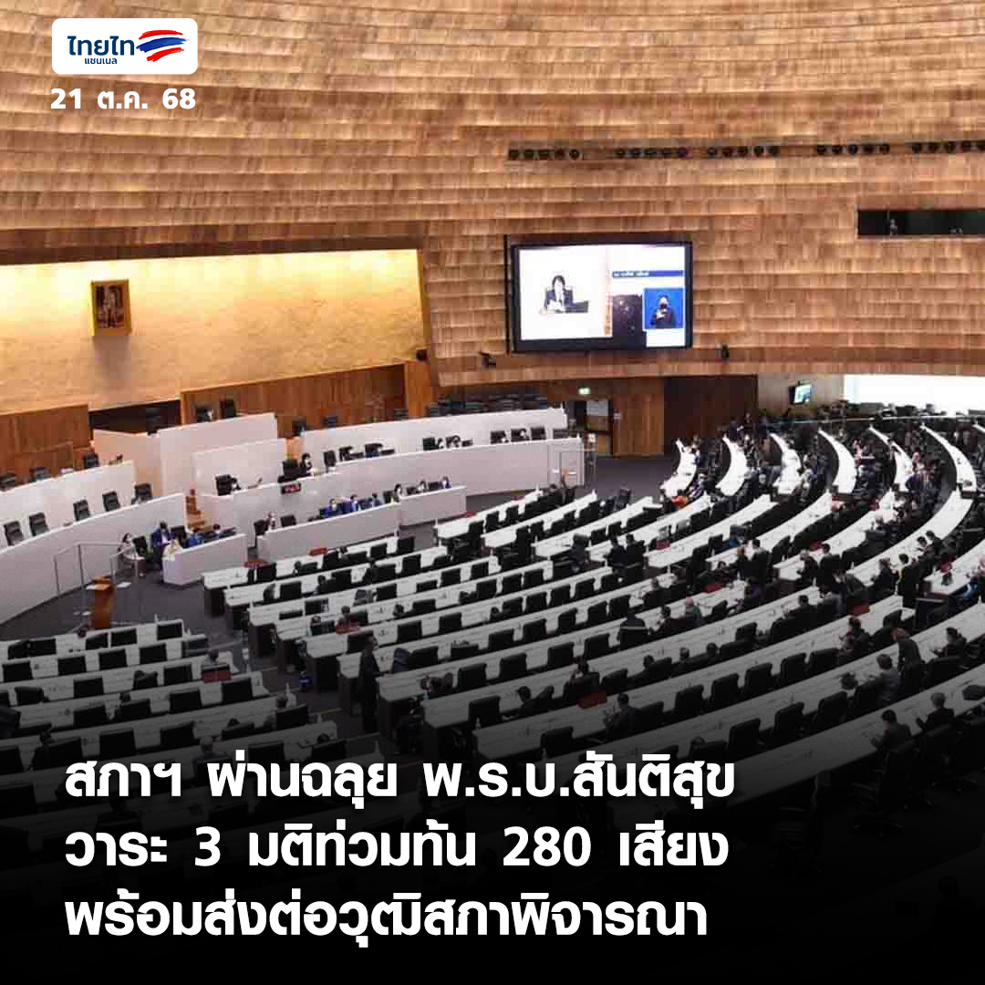 • สภาฯ ผ่านฉลุย พ.ร.บ.สันติสุข วาระ 3 มติท่วมท้น 280 เสียง พร้อมส่งต่อวุฒิสภาพิจารณา