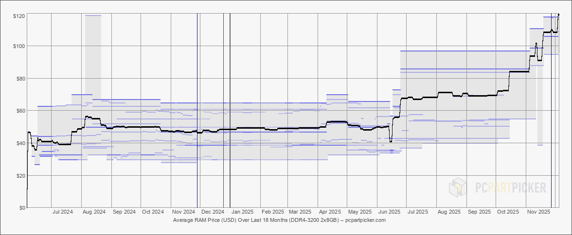 เว็บไซต์ PCPartPicker ได้รวบรวมข้อมูลราคา RAM รุ่นต่าง ๆ เช่น DDR4-3200, DDR4-3600, DDR5-4800, DDR5-6000 ทั้งแบบ 2x8GB, 2x16GB และ 2x32GB โดยใช้ข้อมูลย้อนหลัง 18 เดือน กราฟแสดงเส้นสีดำหนาเป็นค่าเฉลี่ยราคา และแถบสีเทาเป็นช่วงราคาต่ำสุด–สูงสุด ขณะที่จุดสีฟ้าอ่อนคือราคาจริงของสินค้าแต่ละตัว