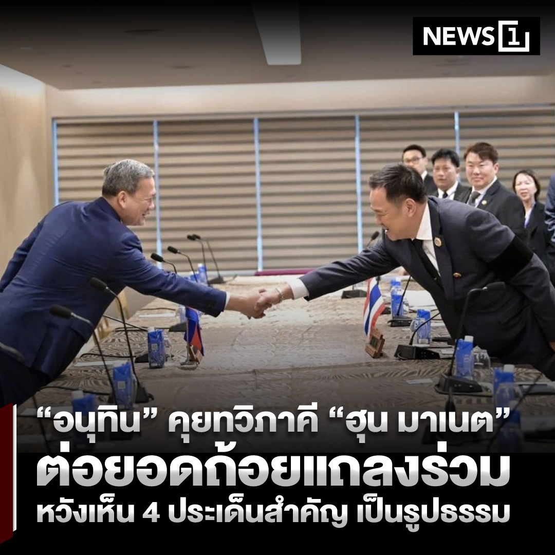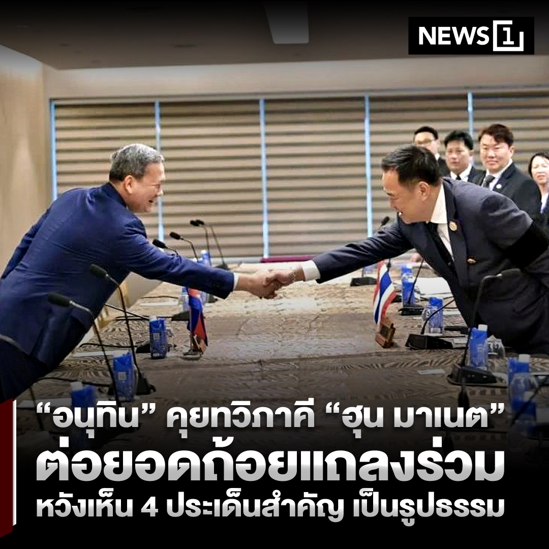 • "อนุทิน-ฮุน มาเนต" หารือทวิภาคีติดตามความคืบหน้าตามถ้อยแถลงร่วม ฝ่ายไทยย้ำ 4 ประเด็นสำคัญ ต้องถอนอาวุธหนักเพื่อความปลอดภัยประชาชน กู้ทุ่นระเบิด ปราบสแกมเมอร์ บริหารจัดการพื้นที่ชายแดน มอบ รมว.กต.ทั้งสองฝ่ายหารือเพิ่มการสื่อสารทางการทูต