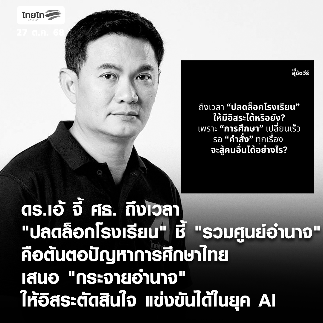 • ดร.เอ้ จี้ ศธ. ถึงเวลา "ปลดล็อกโรงเรียน" ชี้ "รวมศูนย์อำนาจ" คือต้นตอปัญหาการศึกษาไทย เสนอ "กระจายอำนาจ" ให้อิสระตัดสินใจ แข่งขันได้ในยุค AI