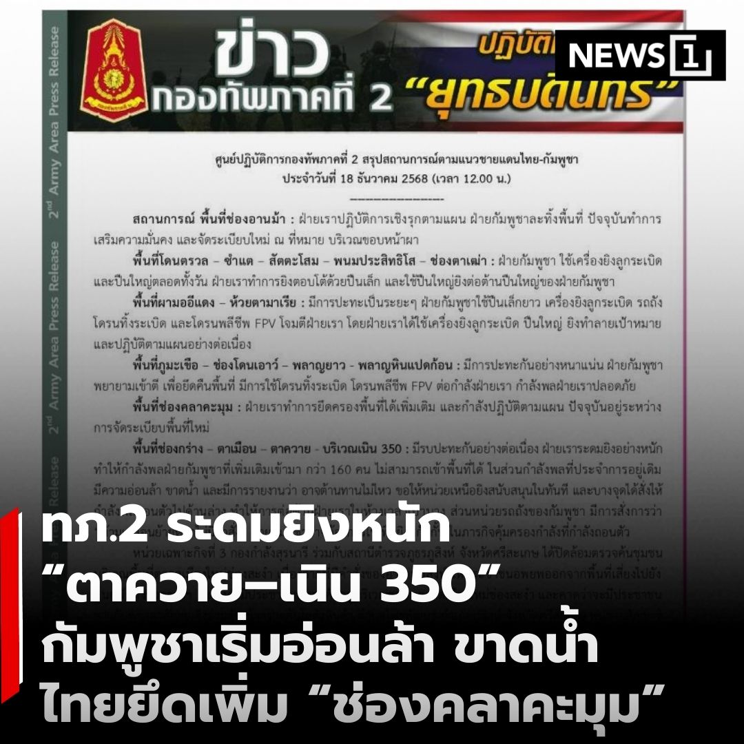 • กองทัพภาคที่ 2 สรุปสถานการณ์แนวชายแดนไทย–กัมพูชา ประจำวันที่ 18 ธันวาคม 2568 ระบุว่าการปะทะยังคงเกิดขึ้นหลายพื้นที่ โดยฝ่ายไทยเดินหน้าปฏิบัติการเชิงรุกตามแผน และสามารถควบคุมสถานการณ์ได้ในหลายจุดสำคัญ