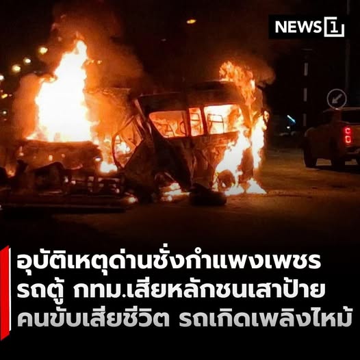 เกิดอุบัติเหตุรถตู้ทะเบียนกรุงเทพมหานคร เสียหลักชนเสาป้ายแสดงผลด่านชั่งน้ำหนักในพื้นที่อำเภอเมืองกำแพงเพชร ช่วงเช้ามืดที่ผ่านมา ส่งผลให้เกิดเพลิงลุกไหม้รถทั้งคัน . เจ้าหน้าที่ตำรวจและหน่วยกู้ภัยเข้าควบคุมสถานการณ์ พบคนขับติดอยู่ภายในรถและเสียชีวิตในที่เกิดเหตุ เบื้องต้นไม่พบผู้โดยสารรายอื่น โดยท้ายรถพบถังเชื้อเพลิง NGV . เจ้าหน้าที่อยู่ระหว่างตรวจสอบสาเหตุอย่างละเอียดจากภาพวงจรปิดและหลักฐานในที่เกิดเหตุ ขณะที่หน่วยงานที่เกี่ยวข้องเข้าประเมินความเสียหายบริเวณด่านชั่งน้ำหนัก . อ่านต่อ >> https://news1live.com/detail/9690000002890 . #News1live #News1 #กำแพงเพชร #อุบัติเหตุ #รถตู้ #ความปลอดภัยทางถนน