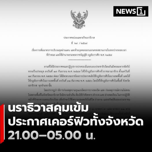 หน่วยเฉพาะกิจนราธิวาส ออกประกาศเพิ่มมาตรการดูแลความปลอดภัยในพื้นที่ กำหนดห้ามบุคคลออกนอกเคหะสถานทั่วทั้งจังหวัดนราธิวาส ในช่วงเวลา 21.00–05.00 น. เริ่มมีผลตั้งแต่วันที่ 11 มกราคม 2569 เป็นต้นไป . มาตรการดังกล่าวเป็นการรับมือกับสถานการณ์ความไม่สงบที่เกิดขึ้นในหลายพื้นที่ พร้อมเพิ่มความเข้มงวดการตรวจสอบการเดินทางและยานพาหนะ โดยเฉพาะบริเวณจุดผ่านแดนชายแดนไทย–มาเลเซีย เพื่อดูแลความปลอดภัยของประชาชนและทรัพย์สิน . ทั้งนี้ การออกนอกเคหะสถานในช่วงเวลาที่กำหนด จะทำได้เฉพาะกรณีมีเหตุจำเป็นเร่งด่วน และต้องได้รับอนุญาตจากเจ้าหน้าที่ในพื้นที่ พร้อมขอความร่วมมือประชาชนปฏิบัติตามมาตรการอย่างเคร่งครัด . อ่านต่อ >> https://news1live.com/detail/9690000003021 . #News1live #News1 #นราธิวาส #เคอร์ฟิว #ความปลอดภัย #ชายแดนใต้