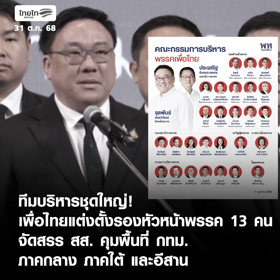 ทีมบริหารชุดใหญ่! เพื่อไทยแต่งตั้งรองหัวหน้าพรรค 13 คน จัดสรร สส. คุมพื้นที่ กทม. ภาคกลาง ภาคใต้ และอีสาน https://www.thai-tai.tv/news/22137/ . #ไทยไท #จุลพันธ์อมรวิวัฒน์ #พรรคเพื่อไทย #กรรมการบริหารพรรค #ประเสริฐจันทรรวงทอง #กกบหชุดใหม่