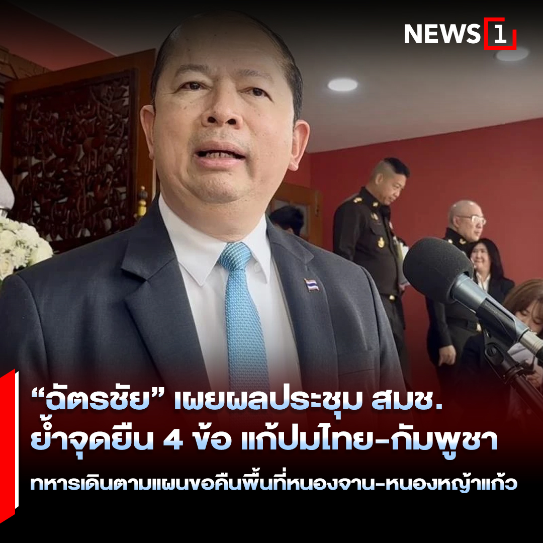 “ฉัตรชัย” เผยที่ประชุม สมช.ย้ำจุดยืน 4 ข้อให้ทุกหน่วยปฏิบัติแก้ปมไทย-กัมพูชา เขมรต้องถอนอาวุธหนัก-เก็บกู้ระเบิด-ปราบสแกมเมอร์-จัดระเบียบชายแดน พร้อมถกสถานการณ์ชายแดนใต้ อนุมัติหลักการตั้งคณะกรรมการพิเศษเชื่อมแก้ปัญหา ส่วนการขอคืนพื้นที่บ้านหนองจานทหารดำเนินอยู่ตามขั้นตอนที่วางไว้ ยังไม่คุยข้อเสนอ "ทรัมป์"