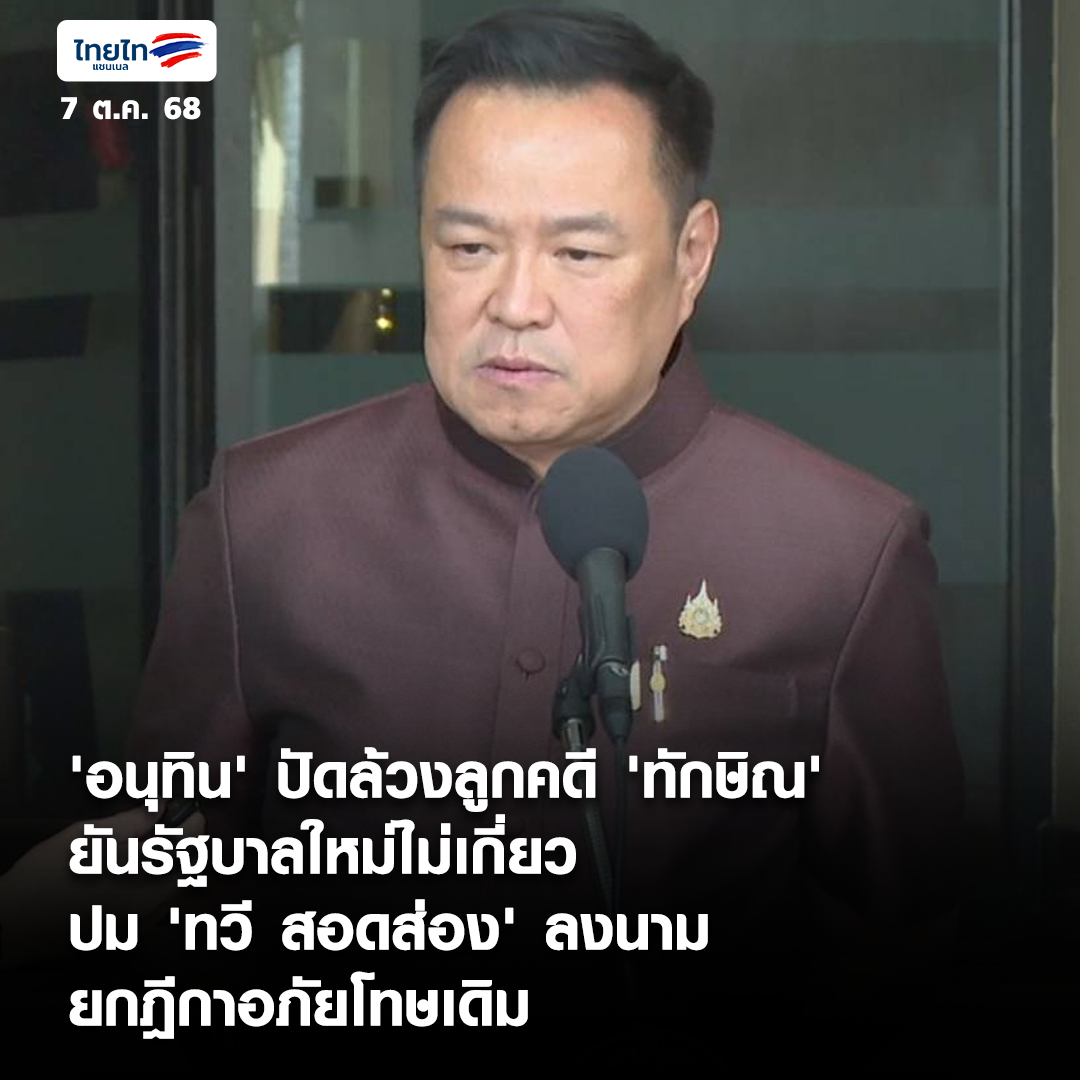 • 'อนุทิน' ปัดล้วงลูกคดี 'ทักษิณ' ยันรัฐบาลใหม่ไม่เกี่ยว ปม 'ทวี สอดส่อง' ลงนามยกฎีกาอภัยโทษเดิม