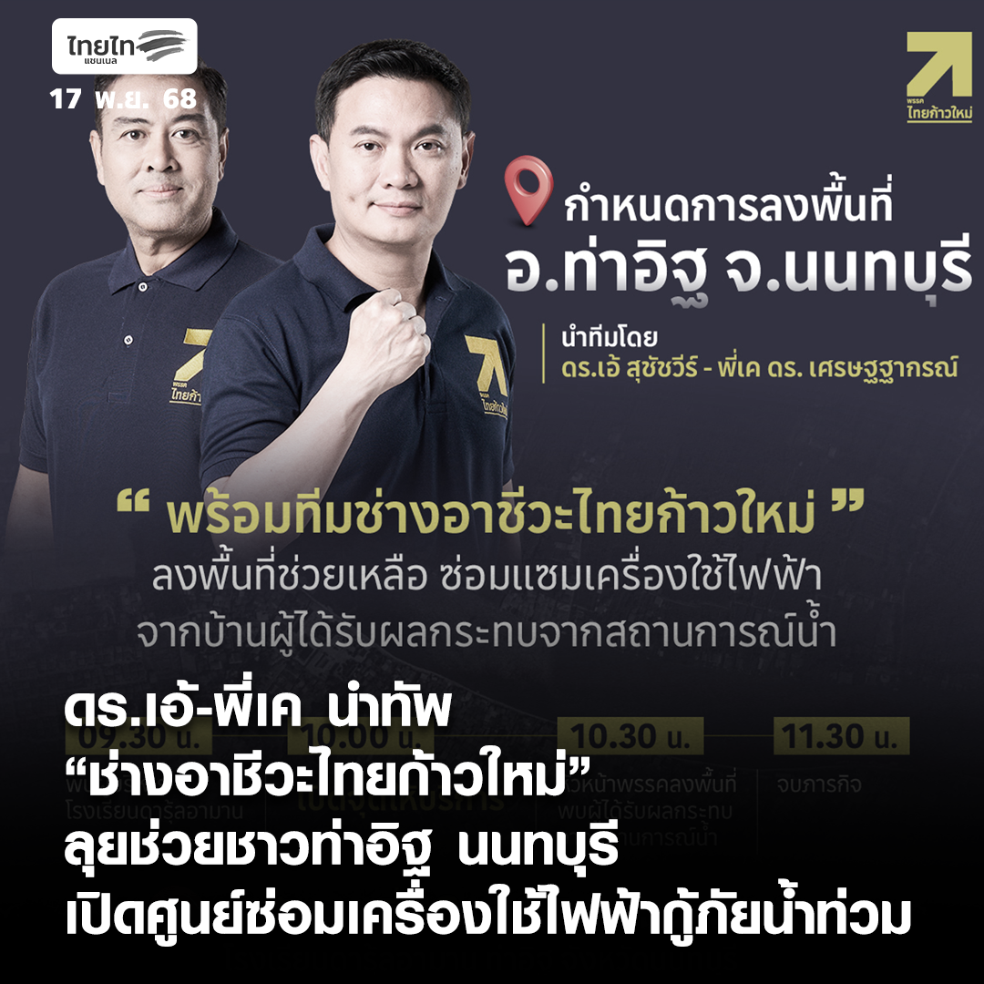 ดร.เอ้-พี่เค นำทัพ “ช่างอาชีวะไทยก้าวใหม่” ลุยช่วยชาวท่าอิฐ นนทบุรี เปิดศูนย์ซ่อมเครื่องใช้ไฟฟ้ากู้ภัยน้ำท่วม https://www.thai-tai.tv/news/22421/