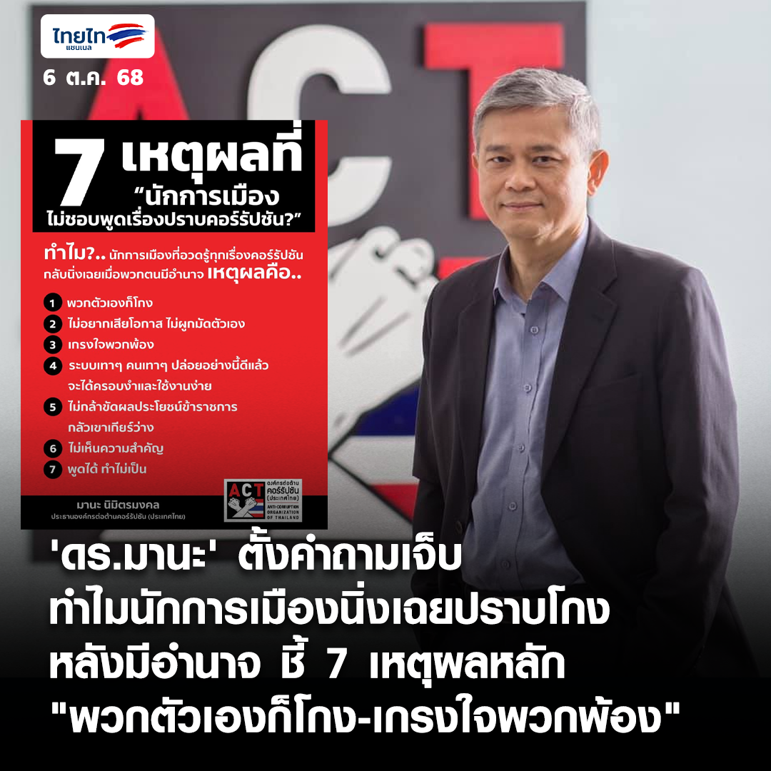 'āļ”āļĢ.āļĄāļēāļ™āļ°' āļ•āļąāđ‰āļ‡āļ„āļģāļ–āļēāļĄāđ€āļˆāđ‡āļš āļ—āļģāđ„āļĄāļ™āļąāļāļāļēāļĢāđ€āļĄāļ·āļ­āļ‡āļ™āļīāđˆāļ‡āđ€āļ‰āļĒāļ›āļĢāļēāļšāđ‚āļāļ‡ āļŦāļĨāļąāļ‡āļĄāļĩāļ­āļģāļ™āļēāļˆ āļŠāļĩāđ‰ 7 āđ€āļŦāļ•āļļāļœāļĨāļŦāļĨāļąāļ "āļžāļ§āļāļ•āļąāļ§āđ€āļ­āļ‡āļāđ‡āđ‚āļāļ‡-āđ€āļāļĢāļ‡āđƒāļˆāļžāļ§āļāļžāđ‰āļ­āļ‡" https://www.thai-tai.tv/news/21783/ . #ACT #āļ­āļ‡āļ„āđŒāļāļĢāļ•āđˆāļ­āļ•āđ‰āļēāļ™āļ„āļ­āļĢāđŒāļĢāļąāļ›āļŠāļąāļ™ #āļ›āļĢāļēāļšāđ‚āļāļ‡ #āļ™āļąāļāļāļēāļĢāđ€āļĄāļ·āļ­āļ‡ #āļĄāļēāļ™āļ°āļ™āļīāļĄāļīāļ•āļĢāļĄāļ‡āļ„āļĨ #āļĢāļ°āļšāļšāđ€āļ—āļēāđ† #āļœāļĨāļ›āļĢāļ°āđ‚āļĒāļŠāļ™āđŒāļ—āļąāļšāļ‹āđ‰āļ­āļ™ #āļ˜āļĢāļĢāļĄāļēāļ āļīāļšāļēāļĨ