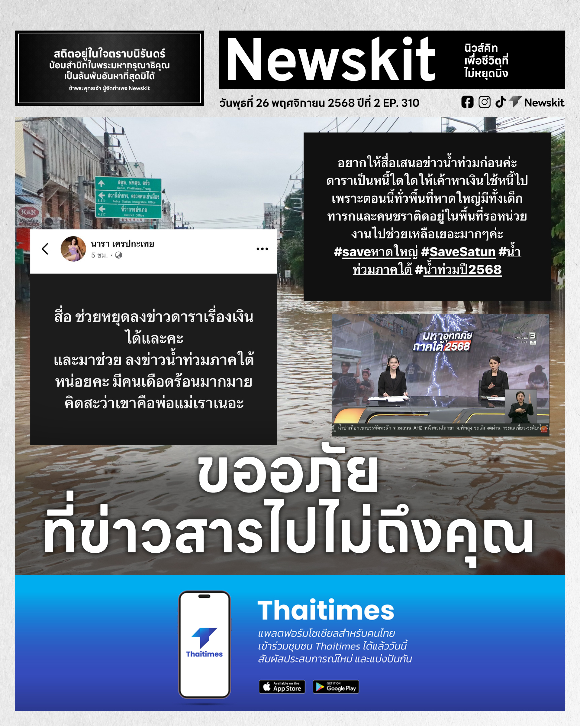 สถานการณ์น้ำท่วมหาดใหญ่ จ.สงขลา และจังหวัดภาคใต้ในช่วงที่ผ่านมา หลายภาคส่วนต่างทำหน้าที่แก้ไขปัญหาสถานการณ์ในรูปแบบต่างๆ เช่นเดียวกับสื่อมวลชนแต่ละสำนัก ต่างทำหน้าที่นำเสนอปัญหาความเดือดร้อนของผู้ประสบภัย และประสานความช่วยเหลือกับภาคส่วนต่างๆ อย่างต่อเนื่อง เช่น สถานีโทรทัศน์ไทยพีบีเอสล้มผังรายการปกติ จัดรายการพิเศษ "มหาอุทกภัยภาคใต้ 2568" ตั้งแต่ 05.30 ถึง 24.00 น.