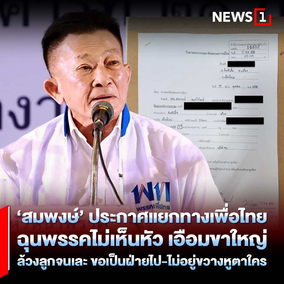 • ‘สมพงษ์ อมรวิวัฒน์’ อดีต หน.เพื่อไทย ส่งคนยื่นลาออก ‘เพื่อไทย’ ที่ กกต. เหตุขัดแย้งภายในพรรค ถูกลดบทบาท-ไม่เห็นหัว ยันไม่ได้โดนดูด ชี้เมืองหลวง ‘เชียงใหม่’ พัง หลังพรรคหนุน ‘พิชัย’ นั่งนายกฯ อบจ. สุดเอือม ‘ผู้มากบารมี’ ล้วงลูกจนเละ จิ้มผู้สมัคร สส.ตามอำเภอใจ ปัดทิ้งพรรคช่วงตกต่ำ แต่อยู่ไม่ไหว-เลือกถอยเอง ไม่เกี่ยว ‘จุลพันธ์’ ที่โตแล้ว ยังกั๊กวางมือการเมือง เผื่อยังมีคนเห็นคุณค่า แย้มอาจกลับไปลง สส.เขต ตามเสียงเชียร์ ปชช.ในพื้นที่