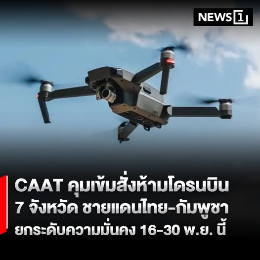 • CAAT คุมเข้มสั่งห้ามโดรนบิน 7 จังหวัดชายแดนไทย-กัมพูชา ยกระดับความมั่นคง 16-30 พ.ย. นี้
