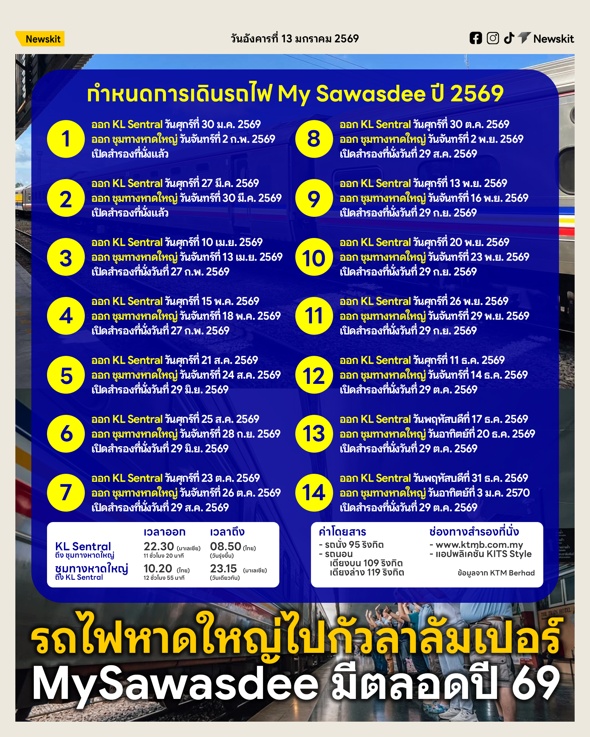 รถไฟหาดใหญ่ไปกัวลาลัมเปอร์ My Sawasdee มีตลอดปี 69 การรถไฟมาเลเซีย (KTM Berhad) ประกาศกำหนดการเดินรถไฟขบวนพิเศษมายสวัสดี (My Sawasdee) จากสถานีเคแอล เซ็นทรัล (KL Sentral) กรุงกัวลาลัมเปอร์ ถึงสถานีชุมทางหาดใหญ่ ประเทศไทย ประจำปี 2569 รวม 14 เที่ยว ซึ่งจะเปิดให้สำรองที่นั่งตามวันที่กำหนด สามารถจองแบบเที่ยวเดียว (One Way) หรือแบบไป-กลับ (Round Trip) ก็ได้ ขาไป ขบวน 1004 (KL Sentral-หาดใหญ่) รถออกจากสถานีเคแอล เซ็นทรัล เวลา 22.30 น. ตามเวลามาเลเซีย จอดรับผู้โดยสารที่สถานีสุไหงบุเลาะห์ (Sungai Buloh) อิโปห์ (Ipoh) ไทปิง (Taiping) และปาดังเบซาร์ (Padang Besar) ถึงสถานีชุมทางหาดใหญ่ เวลา 08.50 น. ตามเวลาประเทศไทย ใช้เวลาเดินทาง 11 ชั่วโมง 20 นาที ส่วนขากลับ ขบวน 1005 (หาดใหญ่-KL Sentral) ออกจากสถานีชุมทางหาดใหญ่ เวลา 10.30 น. ตามเวลาประเทศไทย ผ่านตรวจคนเข้าเมืองที่สถานีปาดังเบซาร์ หยุดจอดส่งผู้โดยสารที่สถานีไทปิง อิโปห์ สุไหงบุเลาะห์ ถึงสถานีเคแอล เซ็นทรัล เวลา 23.15 น. ตามเวลามาเลเซีย ใช้เวลาเดินทาง 12 ชั่วโมง 55 นาที ค่าโดยสาร รถนั่ง ราคา 95 ริงกิต (ประมาณ 735 บาท) รถนอน เตียงบน ราคา 109 ริงกิต (ประมาณ 841 บาท) เตียงล่าง ราคา 119 ริงกิต (ประมาณ 918 บาท) สำรองที่นั่งผ่านเว็บไซต์ https://www.ktmb.com.my หรือแอปพลิเคชัน KITS Style รับชำระด้วยบัตร VISA และ Mastercard คำแนะนำสำหรับนักท่องเที่ยวจากประเทศไทย เนื่องจากรถไฟจะถึงปลายทางกรุงกัวลาลัมเปอร์ก่อนเที่ยงคืนเล็กน้อย ควรมองหาโรงแรมที่มีเวลาเช็กอินยืดหยุ่นหลังเที่ยงคืน ที่สถานี KL Sentral รถไฟฟ้า LRT สายเกอลานาจายา (Kelana Jaya) ไปปูตราไฮส์ (Putra Heights) เที่ยวสุดท้าย 24.08 น. (วันอาทิตย์และวันหยุด 23.50 น.) ไปกอมบัค (Gombak) เที่ยวสุดท้าย 24.12 น. (วันอาทิตย์และวันหยุด 23.42 น.) ส่วนรถไฟโมโนเรลไปตีตี้วังซา (Titiwangsa) เที่ยวสุดท้าย 23.30 น. และรถไฟฟ้า KLIA Ekspres เที่ยวสุดท้ายไปท่าอากาศยานกัวลาลัมเปอร์ 24.00 น. ขากลับจากกรุงกัวลาลัมเปอร์ ไปยัง อ.หาดใหญ่ จ.สงขลา มีรถไฟ ETS จากสถานี KL Sentral ถึงสถานีปาดังเบซาร์ ได้แก่ ขบวน EP9224 เวลา 07.20 น. และขบวน EP9226 เวลา 09.55 น. แล้วต่อรถไฟขบวนที่ 950 ปาดังเบซาร์-ชุมทางหาดใหญ่ เวลา 15.40 น. ตามเวลาประเทศไทย (16.40 น. ตามเวลามาเลเซีย) ถึงสถานีชุมทางหาดใหญ่ 16.25 น. นอกจากนี้ ยังมีรถโดยสารจากสถานีขนส่งทีบีเอส (TBS) ถึงหาดใหญ่ และเที่ยวบินจากท่าอากาศยานกัวลาลัมเปอร์ ถึงท่าอากาศยานหาดใหญ่ โดยสายการบินไทยแอร์เอเชีย และบาติกแอร์ วันละ 1 เที่ยวบิน #Newskit