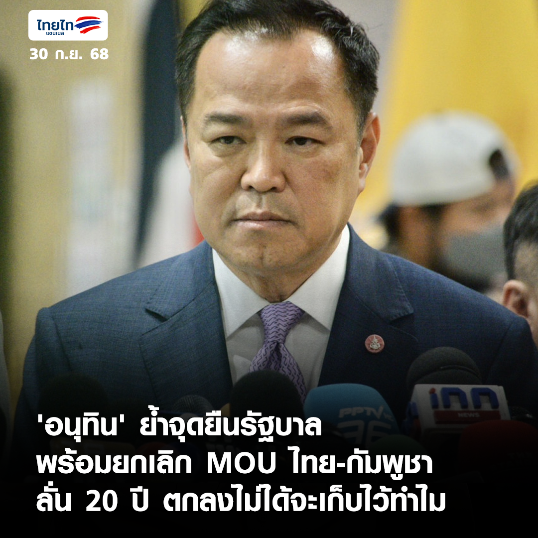 • 'อนุทิน' ย้ำจุดยืน รัฐบาลพร้อมยกเลิก MOU ไทย-กัมพูชา ลั่น 20 ปี ตกลงไม่ได้จะเก็บไว้ทำไม