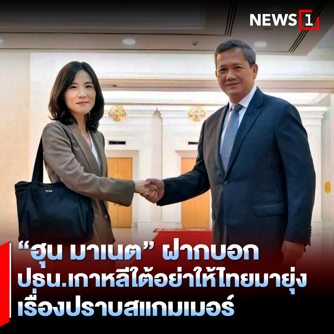 • “ฮุน มาเนต” ฝาก รมช.ต่างประเทศเกาหลีใต้ ไปบอกประธานาธิบดี ไม่ให้ไทยเข้ามายุ่งเรื่องปราบสแกมเมอร์ อ้างเกาหลีและกัมพูชามีความสามารถเพียงพอแก้ปัญหาได้ ไม่ต้องให้ประเทศที่สามมาเกี่ยวข้อง เย้ยไปแก้ปัญหาในประเทศตัวเองดีกว่า