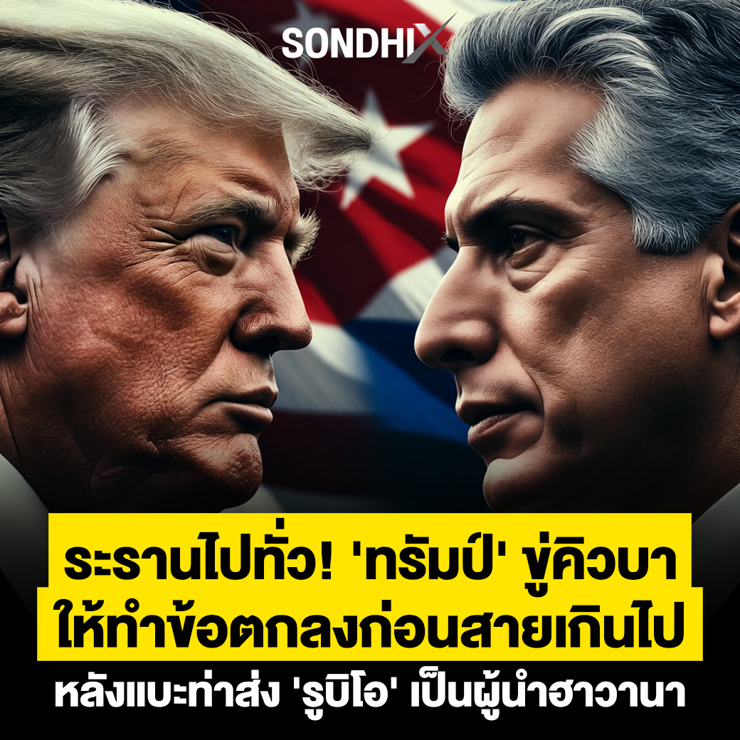 • ประธานาธิบดีโดนัลด์ ทรัมป์ แห่งสหรัฐฯ ระบุในวันอาทิตย์(11ม.ค.) ให้คิวบาทำข้อตกลงหรือไม่อย่างนั้นจะต้องเจอผลสนองที่ไม่ได้เจาะจง คำขู่ที่มีขึ้นหลังจากเห็นด้วยกับข้อความที่ชี้แนะให้ส่ง มาร์โก รูบิโอ รัฐมนตรีต่างประเทศ ไปเป็นผู้นำฮาวานา ความเคลื่อนไหวที่เรียกเสียงขัดขืนด้วยความโกรธเกรี้ยวมาจากพวกผู้นำของประเทศ ที่บอกว่าไม่มีใครสามารถบอกชาติที่้ปกครองด้วยระบอบคอมมิวนิสต์แห่งนี้ได้ว่าต้องทำอะไร