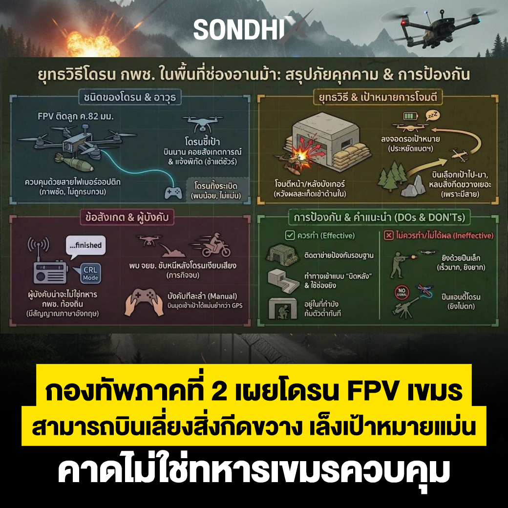 วันนี้( 11 ธ.ค.) เพจ “กองทัพภาคที่ 2“ โพสต์ข้อความ ชำแหละแผนโดรนพลีชีพเขมร งามไส้! ทภ.2 พบคนบังคับไม่ใช่ทหารกัมพูชา โดยได้ระบุข้อความว่า . “#ยุทธวิธีโดรนที่กัมพูชาใช้ในพื้นที่ช่องอานม้า . ลักษณะโดรนที่ใช้จะเป็น FPV ติดลูก ค.82 มม. และใช้สายไฟเบอร์ออปติกในการบังคับ . จะมีโดรนชี้เป้าจำนวน 1 ตัว บินคอยดูสังเกตและแจ้งที่หมาย จากการฟังเสียงจะไม่มีรวดเร็วและบินได้นาน . โดรนพลีชีพจะทิ้งทำลายบริเวณช่องด้านหน้า หรือด้านหลังบังเกอร์ หวังให้สะเก็ดกระเด็นเข้าด้านใน / บางจังหวะมีลงจอดที่พื้นเพื่อประหยัดแบตและรอเป้าหมาย . สังเกตลักษณะการบินจะไม่ผ่านจุดที่มีสิ่งกีดขวางเยอะและบินเลือกเป้าไปกลับไปมา (ทำให้คาดว่าใช้สายไฟเบอร์ออฟติก) . การบังคับจากการสอบถามเพื่อนชุดโดรนที่ใช้ FPV จะสามารถควบคุมได้ 2 ลักษณะ . 1 ให้บินตาม gps ขึ้นได้ทีละหลายลำ แต่จะบินมั่ว ชนกิ่งไม้ หรือตาข่ายง่าย 2 ใช้คนบังคับทีละลำ ลักษณะจะบินหาที่มุดเข้าบังเกอร์ (อานม้าเจอลักษณะนี้) . ข้อสังเกต : คนบังคับน่าจะไม่ใช่ทหาร กพช. เนื่องจากมีสัญญาณเข้ามาวิทยุทางทหารโหมด CRL คำภาษาอังกฤษลงท้ายประโยคว่า finished …. / ประกอบกับจุดตรวจการณ์ จะตรวจพบ จยย. ขับลงไปหลังจากโดรนพลีชีพเงียบไป (ทั้ง 2 วันที่อานม้าโดน) . คำแนะนำ : ตาข่าย และการปิดหลัง รวมถึงช่องยิงช่วยป้องกัน / การยิงปืนทำลายได้ยากเนื่องจากบินเร็วมาก / ปืนแอนตี้โดรนยิงไม่ตก (อยู่ในบังเกอร์ก้มตัวต่ำครับ)” . อ่านเพิ่มเติม..https://sondhitalk.com/detail/9680000118925 #Sondhitalk #SondhiX #คุยทุกเรื่องกับสนธิ #สนธิเล่าเรื่อง #Thaitimes #กัมพูชายิงก่อน #ไทยนี้รักสงบแต่ถึงรบไม่ขลาด #CambodiaOpenedFire