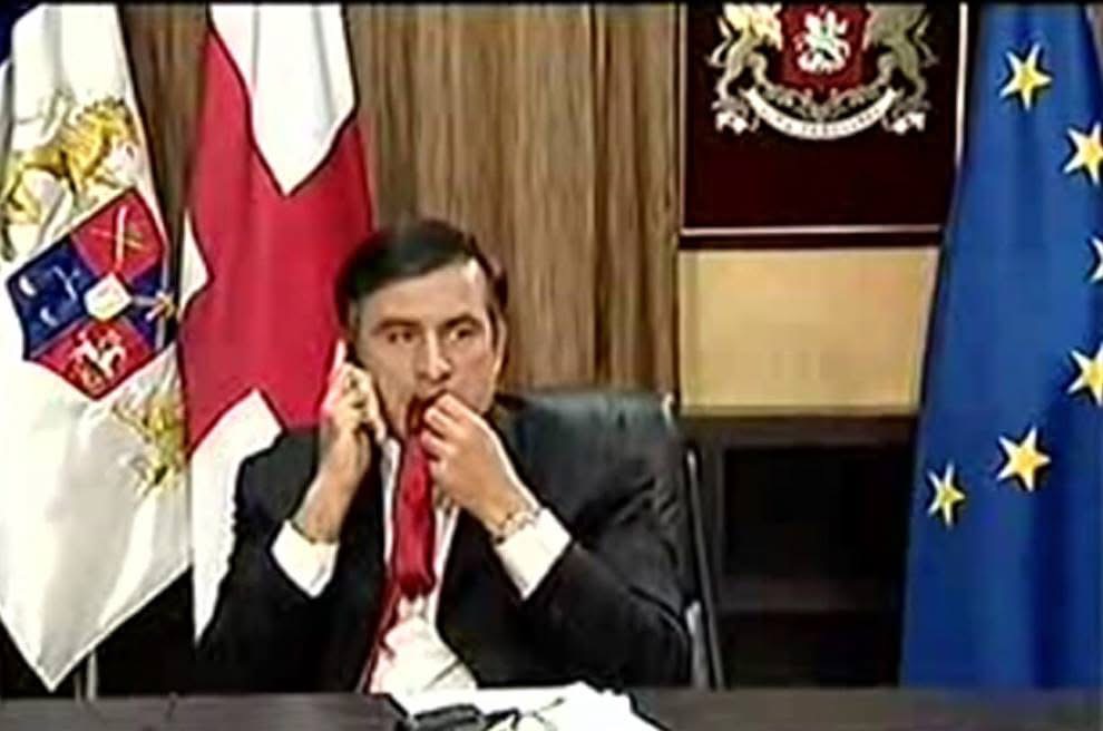 เขาว่า ระหว่างที่นายสากกำลังทำหน้าหล่อ (จากการฉีดโบทอกซ์ ด้วยเงินภาษีของประชาชนชาวจอร์เจีย) เพลิดเพลินกับการให้สัมภาษณ์ข่าวโทรทัศน์ Gori ใน South Ossetia เมื่อวันที่ 11 สิงหาคม ค.ศ.2008 เครื่องบินรบของกองทัพฝ่ายรัสเซียก็บินโฉบเข้ามาพอดี กล้องก็เลยจับได้ภาพนายสากที่กำลังมุดหลบเข้าไปอยู่ใต้หว่างขาของผู้คุ้มกันอย่างรวดเร็ว หน้าของนายสาก บิดเบี้ยว สีออกเขียวอมเทา ด้วยความตื่นตระหนกสุดขีด ไม่เหลือราคาโบทอกซ์ ที่ใช้เงินภาษีประชาชนจ่ายค่าฉีด