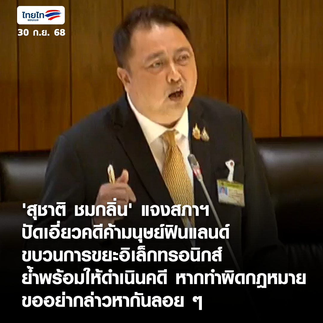 'สุชาติ ชมกลิ่น' แจงสภาฯ ปัดเอี่ยวคดีค้ามนุษย์ฟินแลนด์ ขบวนการขยะอิเล็กทรอนิกส์ ย้ำพร้อมให้ดำเนินคดี หากทำผิดกฎหมาย ขออย่ากล่าวหากันลอย ๆ