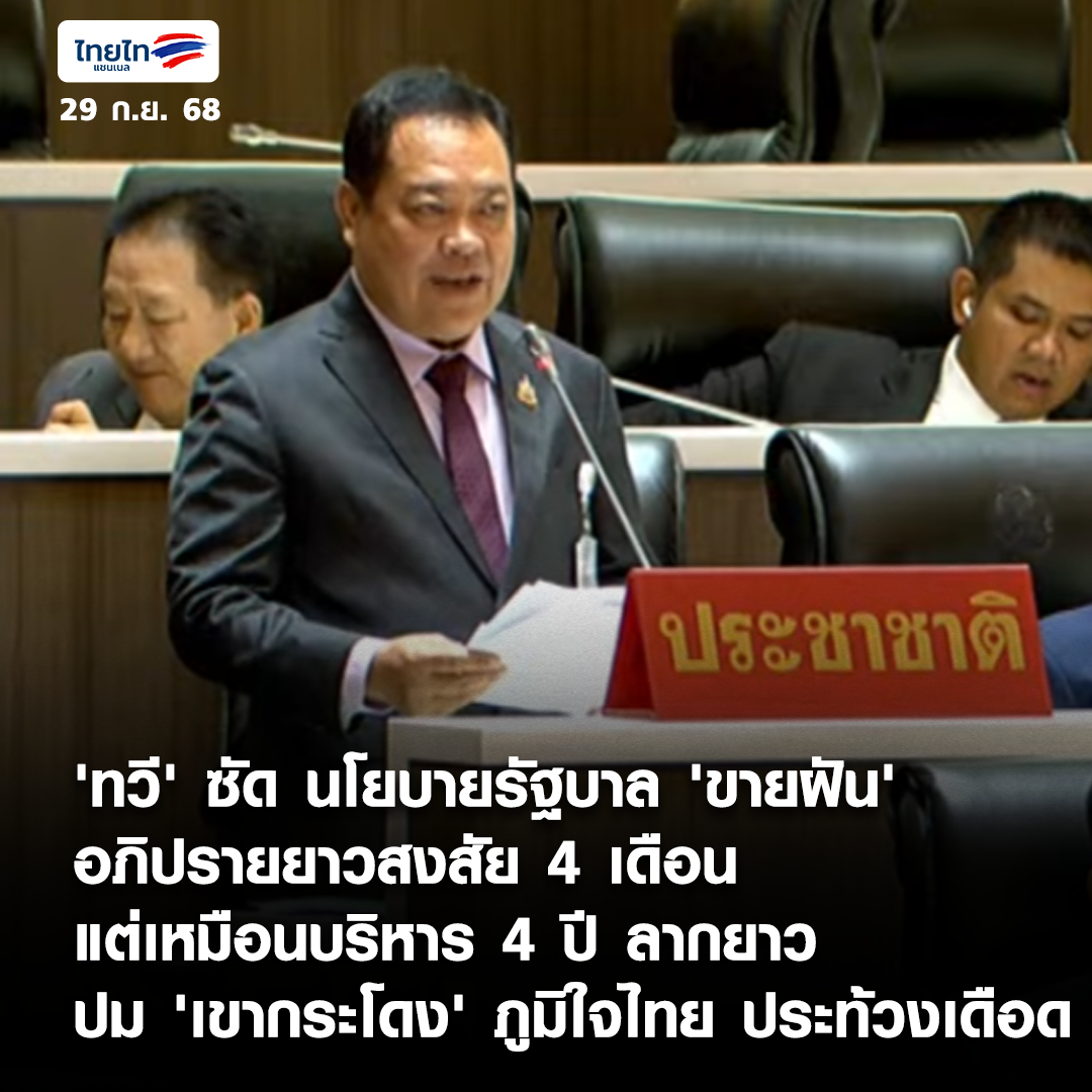 'ทวี' ซัด นโยบายรัฐบาล 'ขายฝัน' อภิปรายยาวสงสัย 4 เดือนแต่เหมือนบริหาร 4 ปี ลากยาวปม 'เขากระโดง' ภูมิใจไทย ประท้วงเดือด https://www.thai-tai.tv/news/21671/ . #แถลงนโยบายรัฐบาล #ทวีสอดส่อง #เขากระโดง #ฮั้วสว #อภิปรายรัฐสภา #งบประมาณ2569 #ภูมิใจไทย #การรถไฟ #การเมืองไทย