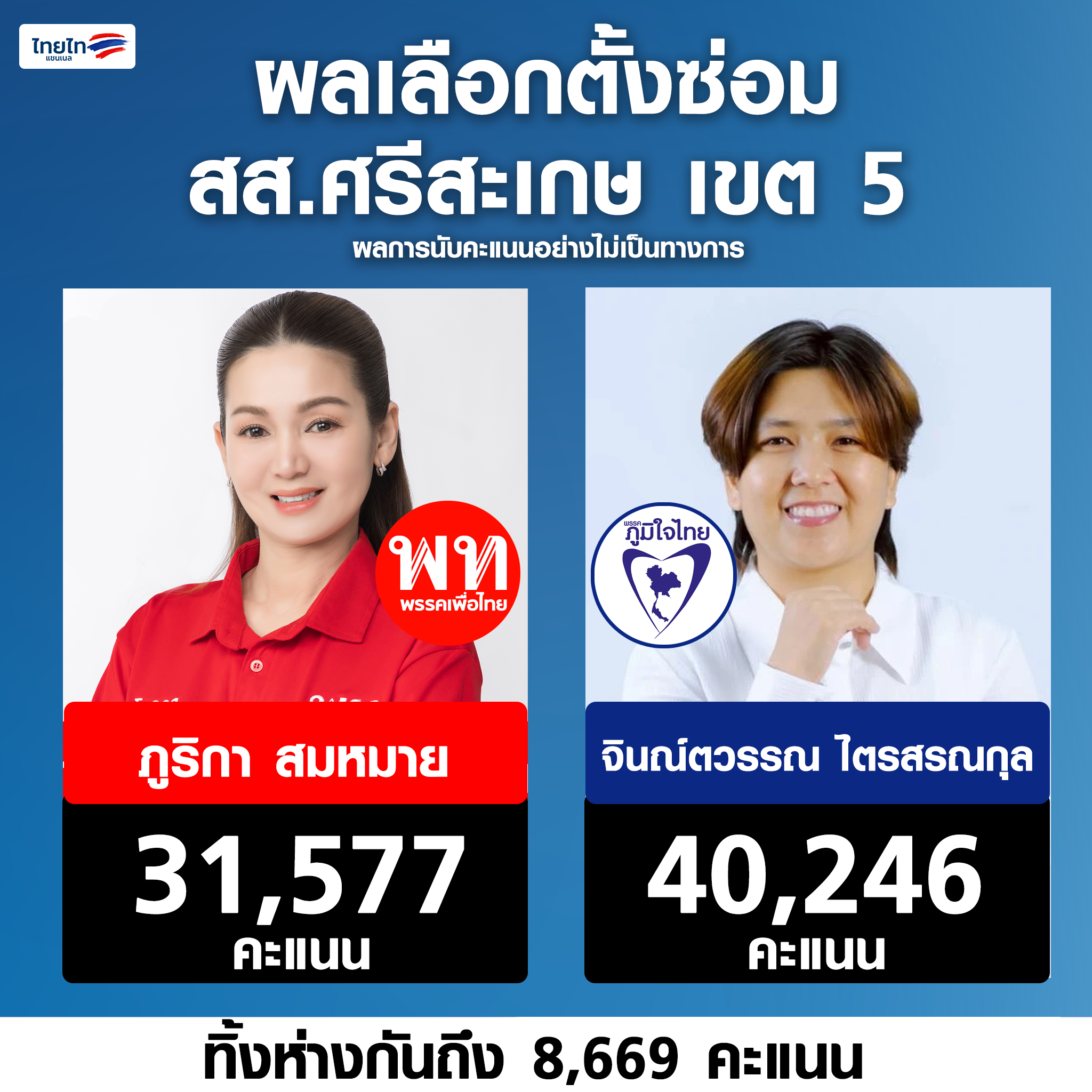#เลือกตั้งซ่อมศรีสะเกษ #ศรีสะเกษเขต5 #ภูมิใจไทย #เพื่อไทย #จินณ์ตวรรณไตรสรณกุล #ภูริกาสมหมาย #ผลเลือกตั้งไม่เป็นทางการ #การเมืองไทย