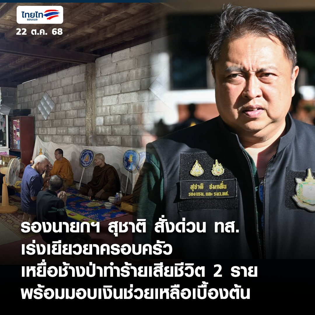 • "รองนายกฯ สุชาติ" สั่ง! กรมอุทยานฯ เร่งเยียวยาครอบครัว 2 ผู้เสียชีวิตเหตุช้างป่าทำร้าย พร้อมกำชับมาตรการเฝ้าระวังสูงสุด