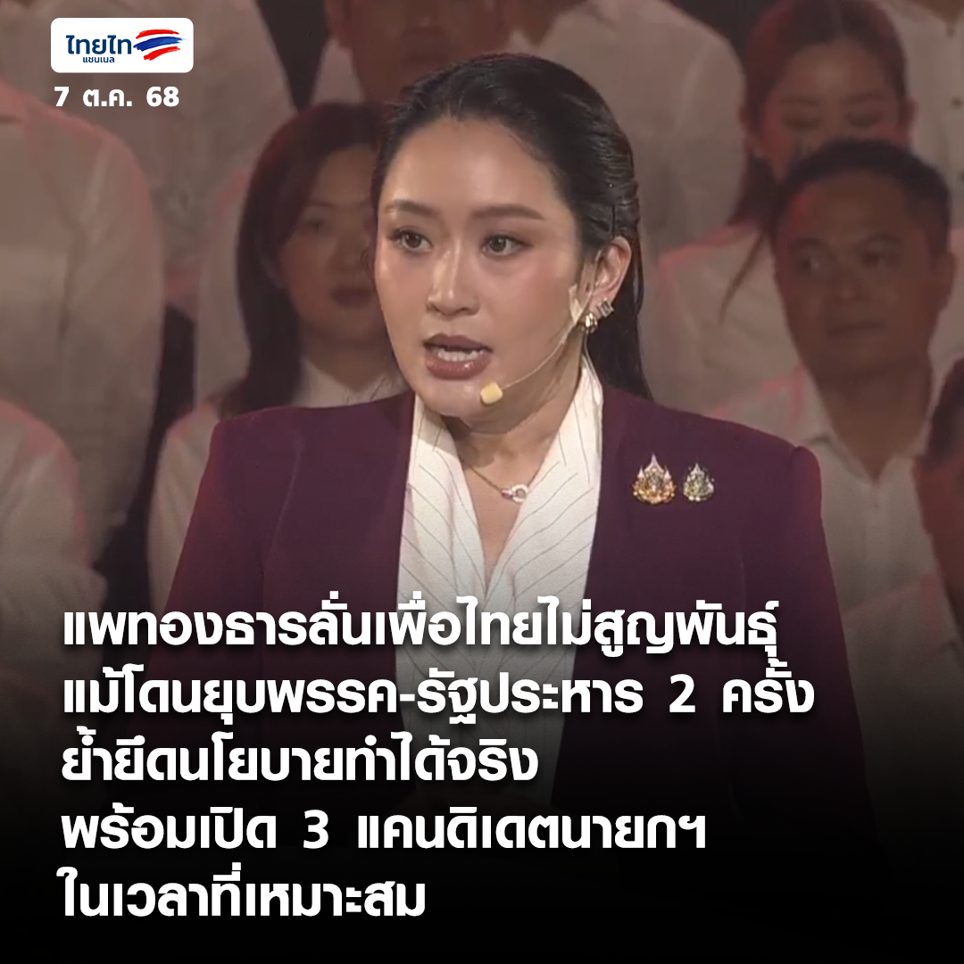 • แพทองธารลั่นเพื่อไทยไม่สูญพันธุ์ แม้โดนยุบพรรค-รัฐประหาร 2 ครั้ง ย้ำยึดนโยบายทำได้จริง พร้อมเปิด 3 แคนดิเดตนายกฯ ในเวลาที่เหมาะสม