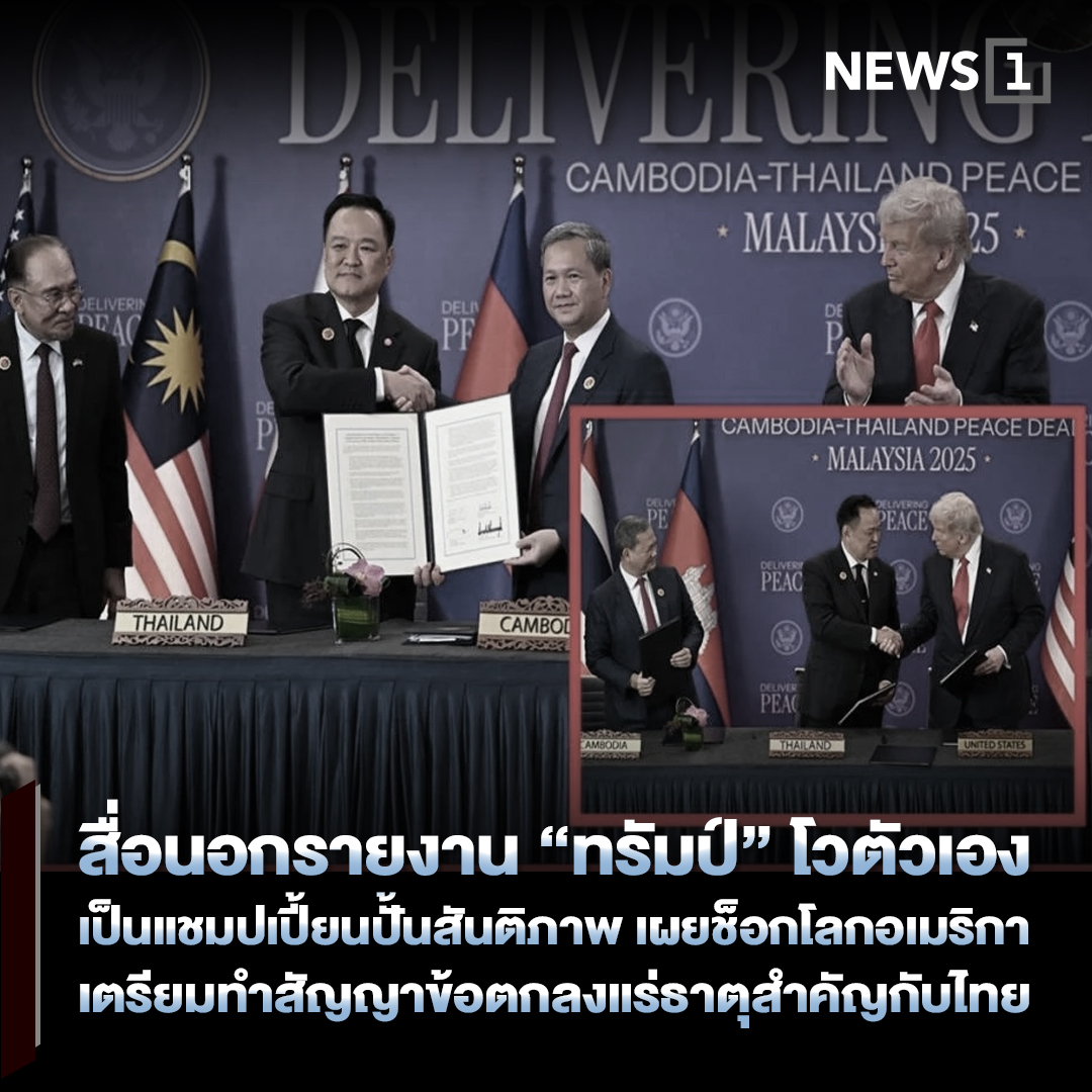 • ประธานาธิบดีสหรัฐฯ โดนัลด์ ทรัมป์ วันอาทิตย์(26 ต.ค)ว่า แถลงยืนยันก่อนพิธีลงนามข้อตกลงสันติภาพไทย-กัมพูชาที่เริ่มมาตั้งแต่กรกฎาคมว่า สหประชาชาติสมควรทำในสิ่งนี้แต่คนเหล่านั้นไม่ยอมทำ พร้อมเปิดเผยว่า ตัวเองนั้นมีควาสามารถในด้านเป็นคนกลางไกล่เกลี่ยเพื่อนำไปสู่ข้อตกลงสันติภาพระหว่างไทยและกัมพูชาและเป็นคนที่ชอบในการเป็นแชมเปียนสันติภาพ พร้อมเผยกำลังเตรียมลงนามข้อตกลงแร่ธาตุสำคัญร่วมกับไทยเพื่อแก้ปัญหาการผูกขาดแร่ธาตุจากคู่ปรับจีน