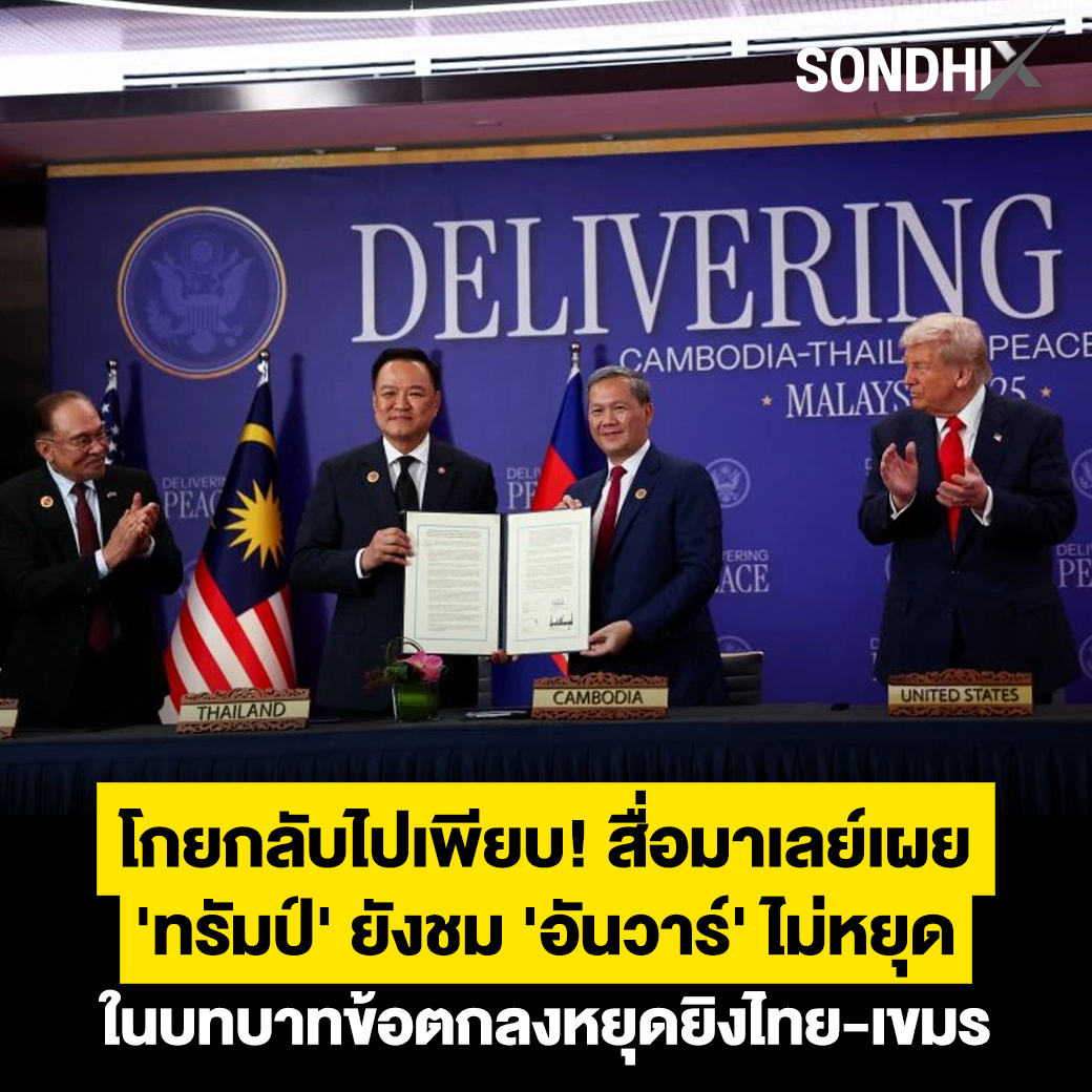 ประธานาธิบดีโดนัลด์ ทรัมป์ แห่งสหรัฐฯ ยังไม่หยุดเอ่ยปากชมความเป็นผู้นำของมาเลเซีย ภายใต้นายกรัฐมนตรีอันวาร์ อิบราฮิม ต่อบทบาทของกัวลาลัมเปอร์ ที่นำมาซึ่งข้อตกลงสันติภาพประวัติศาสตร์ระหว่างกัมพูชาและไทยเมื่อสัปดาห์ที่แล้ว ตามรายงานของเบอร์นามา สื่อมวลชนมาเลเซีย . อ่านเพิ่มเติม..https://sondhitalk.com/detail/9680000103516 #Sondhitalk #SondhiX #คุยทุกเรื่องกับสนธิ #สนธิเล่าเรื่อง #Thaitimes #กัมพูชายิงก่อน #ไทยนี้รักสงบแต่ถึงรบไม่ขลาด #CambodiaOpenedFire