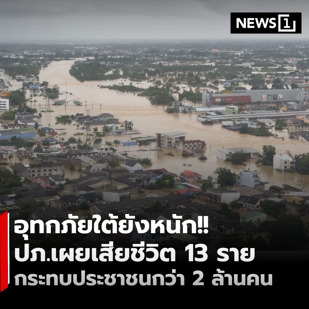 • ปภ.รายงานสถานการณ์น้ำท่วมภาคใต้ยังรุนแรง ครอบคลุม 9 จังหวัด รวม 98 อำเภอ กระทบประชาชนกว่า 798,000 ครัวเรือน รวมกว่า 2.19 ล้านคน และมีผู้เสียชีวิตแล้ว 13 ราย ขณะที่ทั้งประเทศมีผู้ได้รับผลกระทบกว่า 2.68 ล้านคน