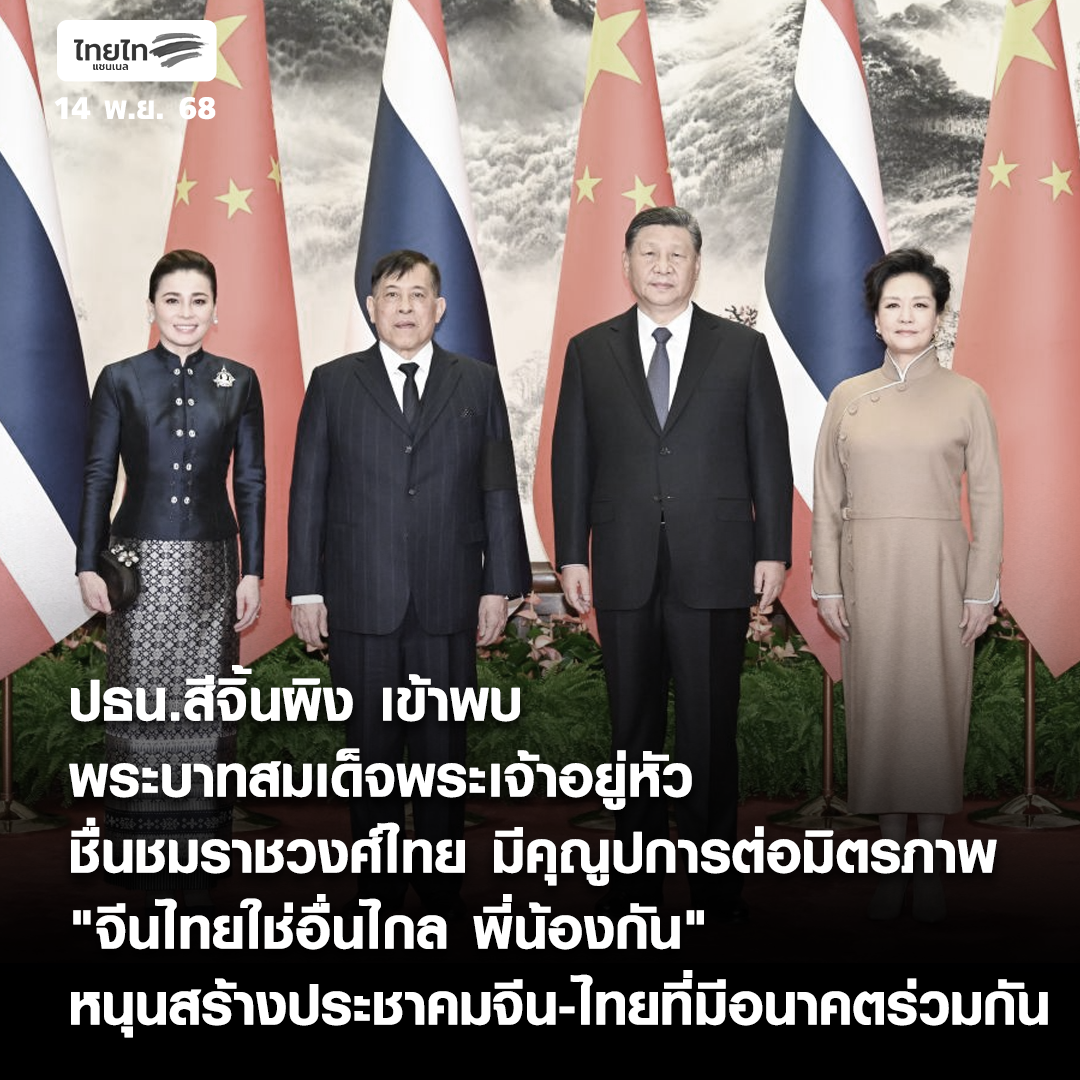 • ปธน.สีจิ้นผิง เข้าพบ พระบาทสมเด็จพระเจ้าอยู่หัว ชื่นชมราชวงศ์ไทย มีคุณูปการต่อมิตรภาพ "จีนไทยใช่อื่นไกล พี่น้องกัน" หนุนสร้างประชาคมจีน-ไทยที่มีอนาคตร่วมกัน