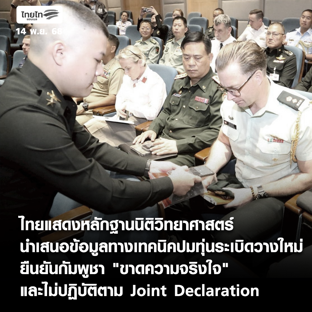 • ไทยแสดงหลักฐานนิติวิทยาศาสตร์ นำเสนอข้อมูลทางเทคนิคปมทุ่นระเบิดวางใหม่ ยืนยันกัมพูชา "ขาดความจริงใจ" และไม่ปฏิบัติตาม Joint Declaration