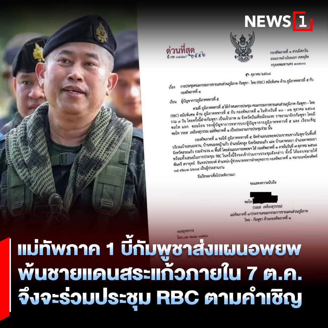 แม่ทัพภาคที่ 1 ส่งหนังสือตอบกลับ ผบ.ภูมิภาคทหารที่ 5 ของกัมพูชา เร่งให้จัดทำแผนอพยพประชาชนชาวกัมพูชาออกจากชายแดน จ.สระแก้ว ภายใน 7 ต.ค. พร้อมเสนอในการประชุม RBC จึงจะเข้าร่วมประชุมกับกัมพูชาตามคำเชิญ