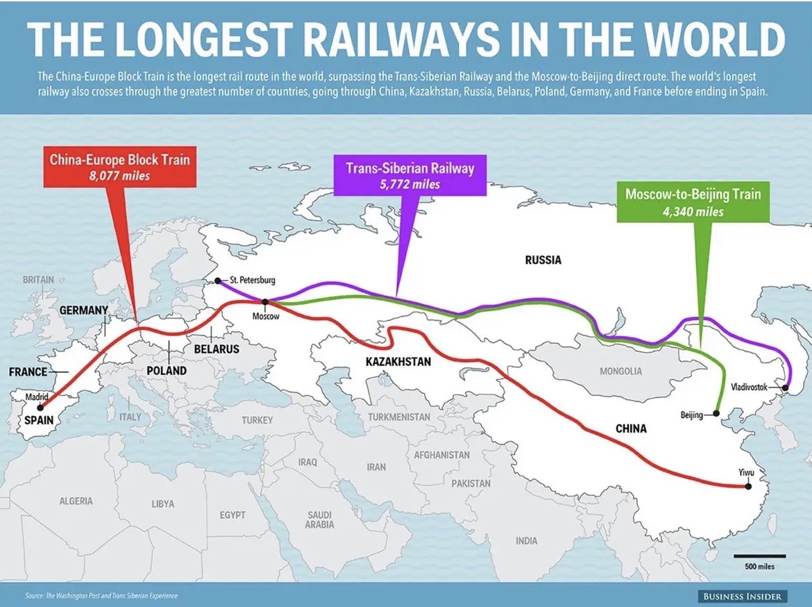 นับเป็นครั้งแรกในประวัติศาสตร์ ที่มีการขนส่งสินค้าทั้งขนาดเล็ก และขนาดใหญ่ รวมทั้งน้ำมัน และแร่ธาตุ ในปริมาณที่สูงมากได้พร้อมกัน ไปทางรถไฟเที่ยวเดียวกัน และข้ามทวีปทางบกได้ มันเป็นเส้นทางที่ยาวประมาณ 7,000 ไมล์ จากยิวูของจีน ถึงมาดริดของสเปน การขนส่งสินค้าครั้งละมากๆ มีทางเลือกแล้ว ไม่จำเป็นต้องพึ่งเส้นทางเรือแต่อย่างเดียวอีกต่อไป และอำนาจของฝ่ายอยู่เกาะ ก็เริ่มจะเสทือน