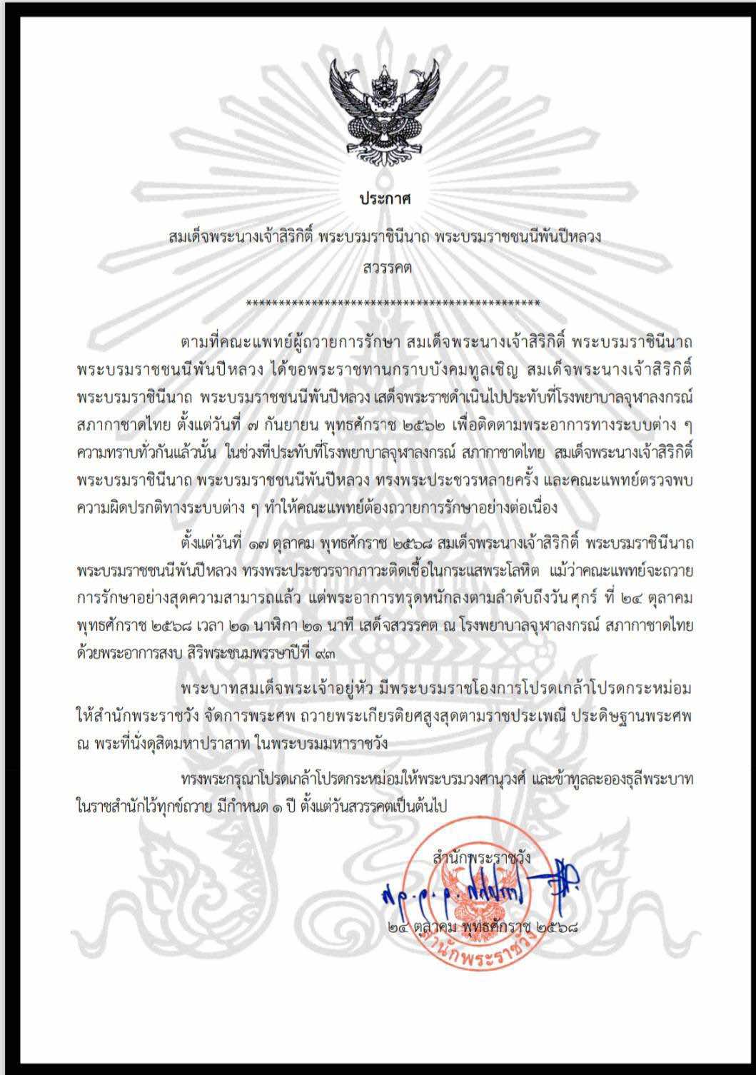 สำนักพระราชวัง เผยแพร่ประกาศ สมเด็จพระนางเจ้าสิริกิติ์ พระบรมราชินีนาถ พระบรมราชชนนีพันปีหลวง สวรรคต